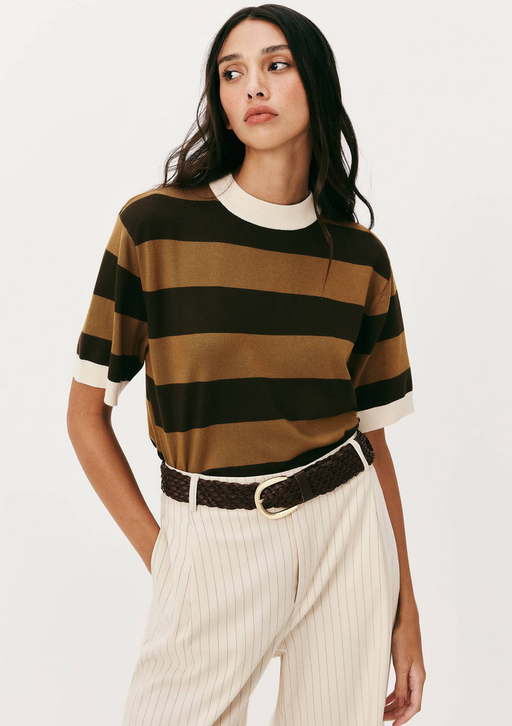Blusa em tricô leve, confeccionada em viscose com poliamida, que garante toque macio, caimento fluido e conforto ao vestir. Apresenta padronagem listrada atemporal, decote redondo careca e modelagem relaxed, sendo solta em todo o corpo. Ideal para compor produções com leveza e estilo em qualquer estação.Detalhes da peça:Em tricôModelagem relaxedMeia mangaDecote redondo