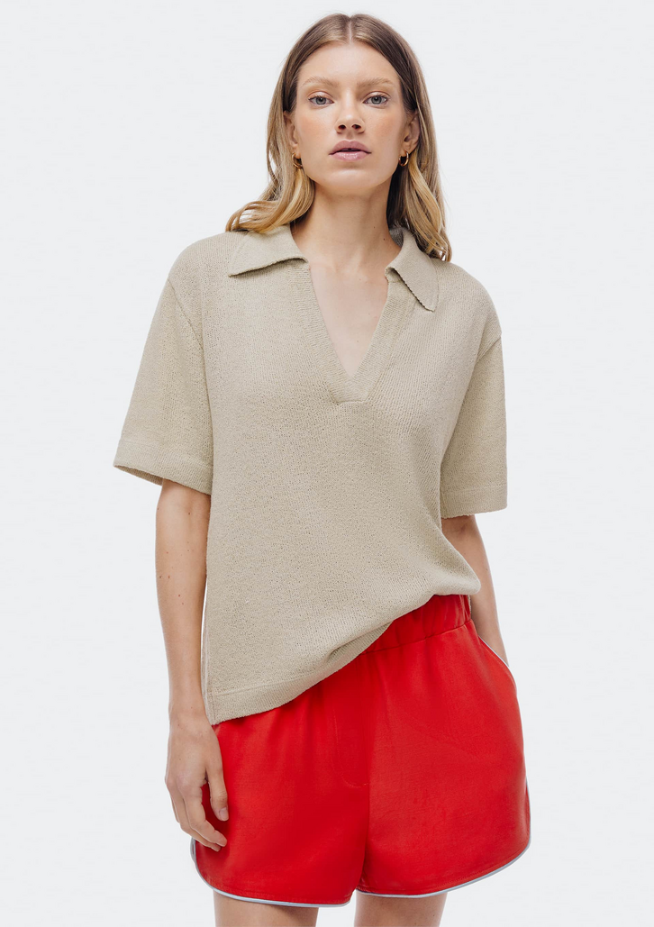 Blusa polo feminina em modelagem levemente oversized confeccionada em tricô. Possui decote V e mangas curtas. Ideal para um visual moderno e confortável.
