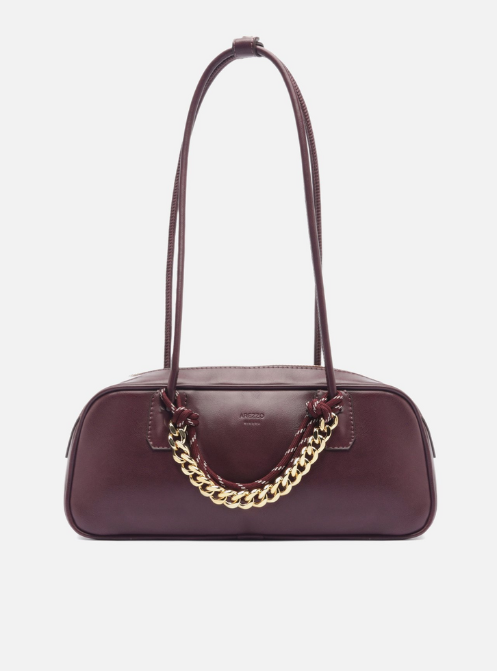 Bolsa bowling grande bordô. O acessório tem formato alongado e estruturado. Possui duas alças longas de ombro e fecho superior em zíper. Traz detalhe frontal com aplicação de corrente metálica dourada, combinada a tira dupla em cordão na mesma cor da bolsa.