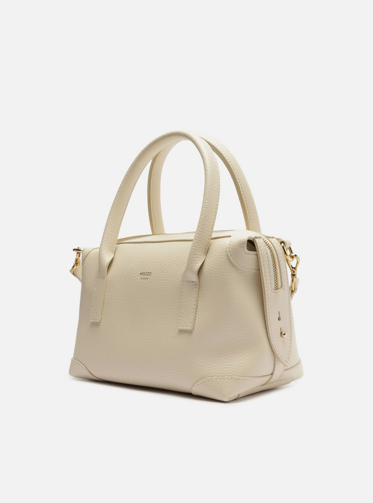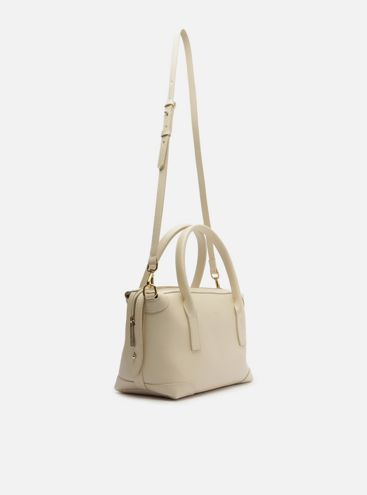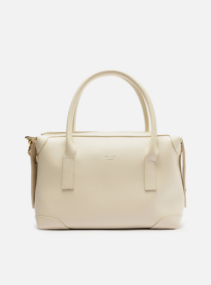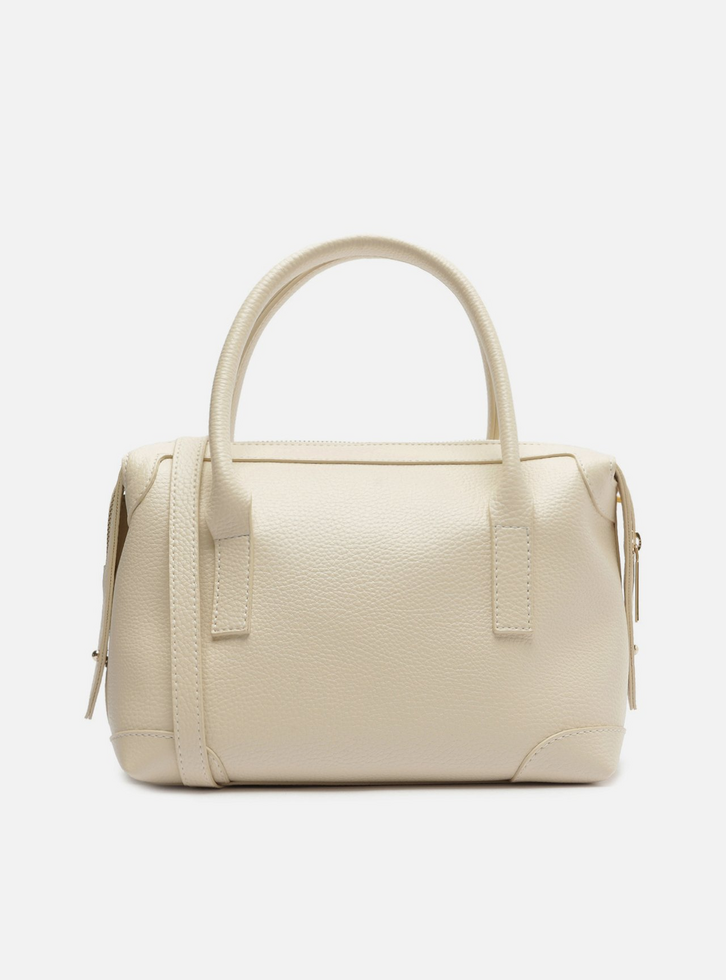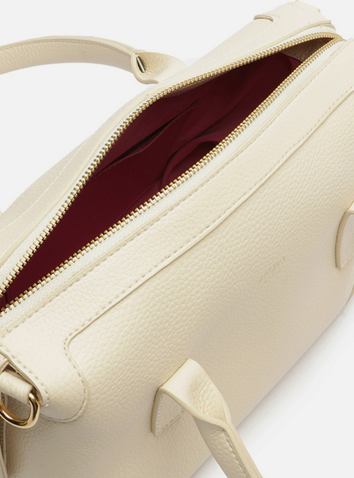 Bolsa bowling grande branca. O acessório tem formato retangular, laterais arredondadas e acabamento texturizado. Traz alça lateral fina, duas alças de mão, fecho em zíper estendido e puxador. Com recortes e inscrição do nome da marca na capa.