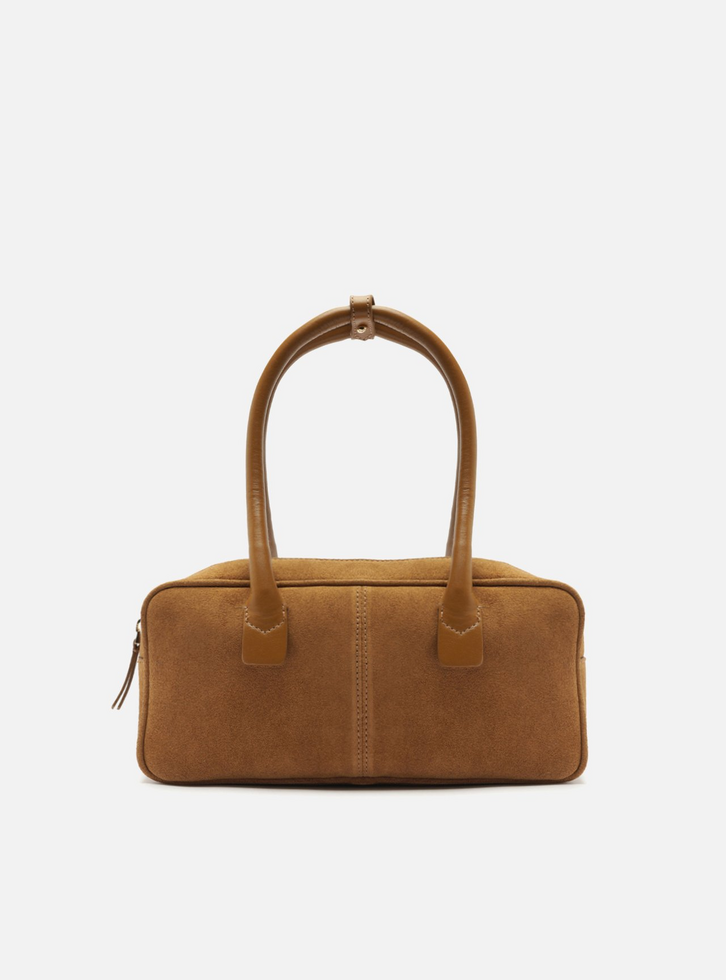Bolsa bowling feminina média marrom em couro acamurçado. O acessório tem formato retangular com cantos arredondados e base reforçada. Traz duas alças de mão e alça longa regulável e removível em couro, presa por metais dourados. Possui fecho superior em zíper e interior forrado em tecido com aplicação interna em couro.