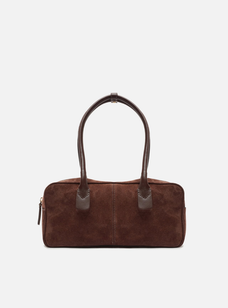 Bolsa bowling feminina média marrom em couro acamurçado. O acessório tem formato retangular com cantos arredondados e base reforçada. Traz duas alças de mão e alça longa regulável e removível em couro, presa por metais dourados. Possui fecho superior em zíper e interior forrado em tecido com aplicação interna em couro.