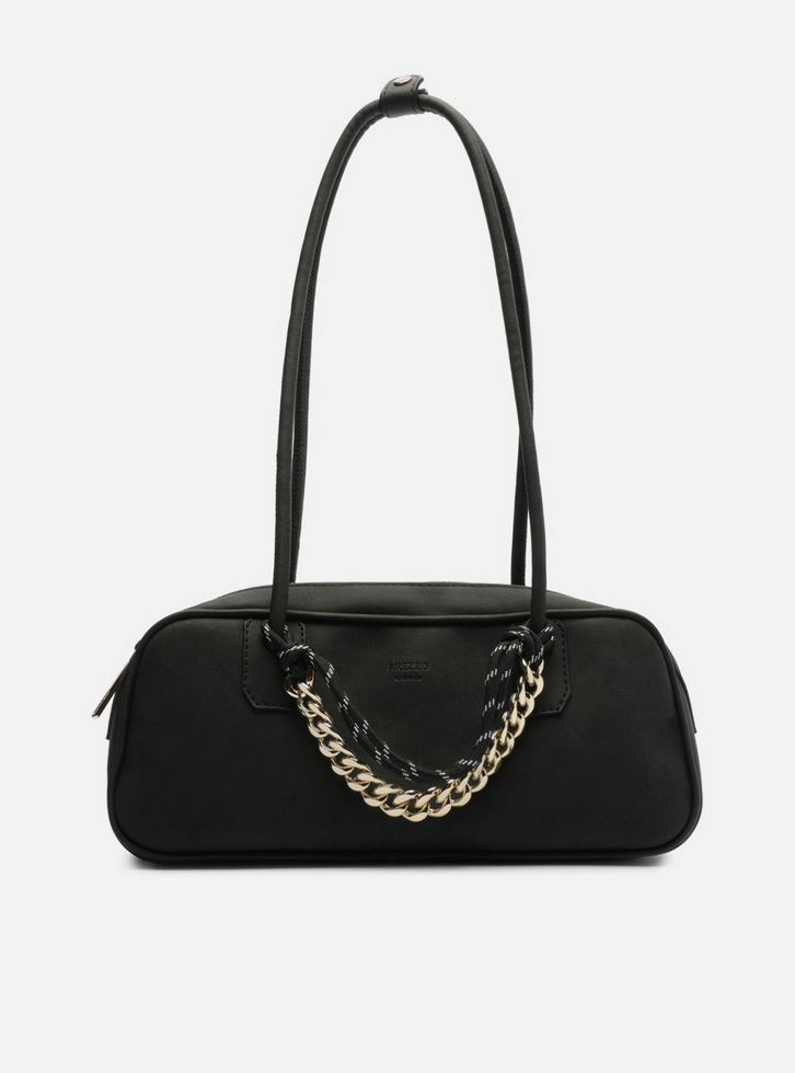 Bolsa feminina bowling grande preta em nobuck com acabamento emborrachado. O acessório tem formato retangular e estruturado, laterais arredondadas e fecho em zíper com puxador. Possui duas alças de ombro. Detalhe frontal em corrente metálica dourada e cordão da cor da bolsa, presos a uma das alças por nós.