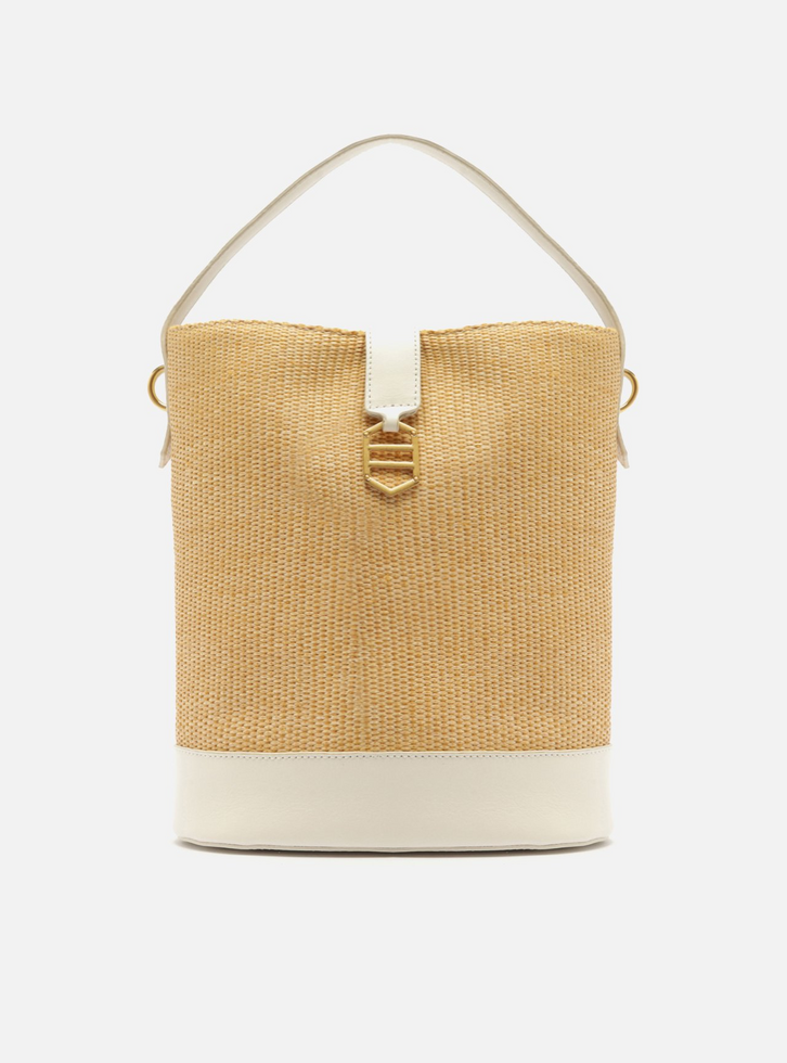 Bolsa bucket feminina média em palha natural com detalhes em couro branco. O acessório tem formato cilíndrico e estruturado, corpo em palha tramada e base em couro liso. Traz alça de mão e alça longa regulável e removível em couro branco, presas por metais dourados, além de tira superior em couro com imã e peça metálica geométrica. Possui interior forrado em linho.