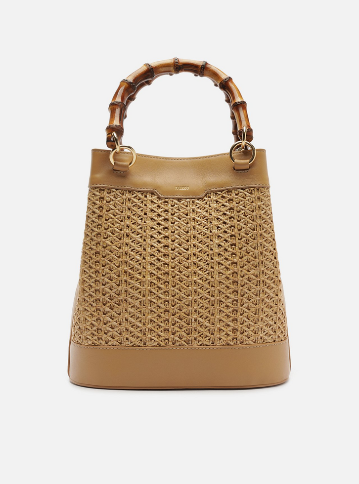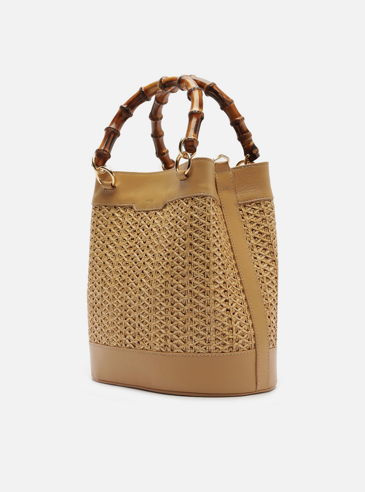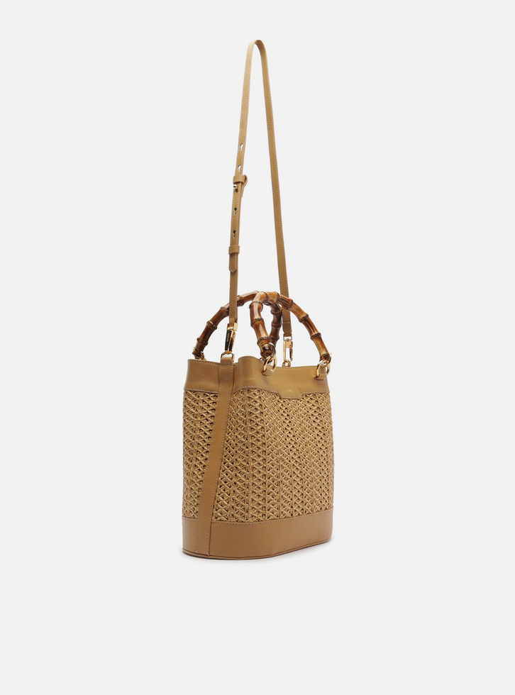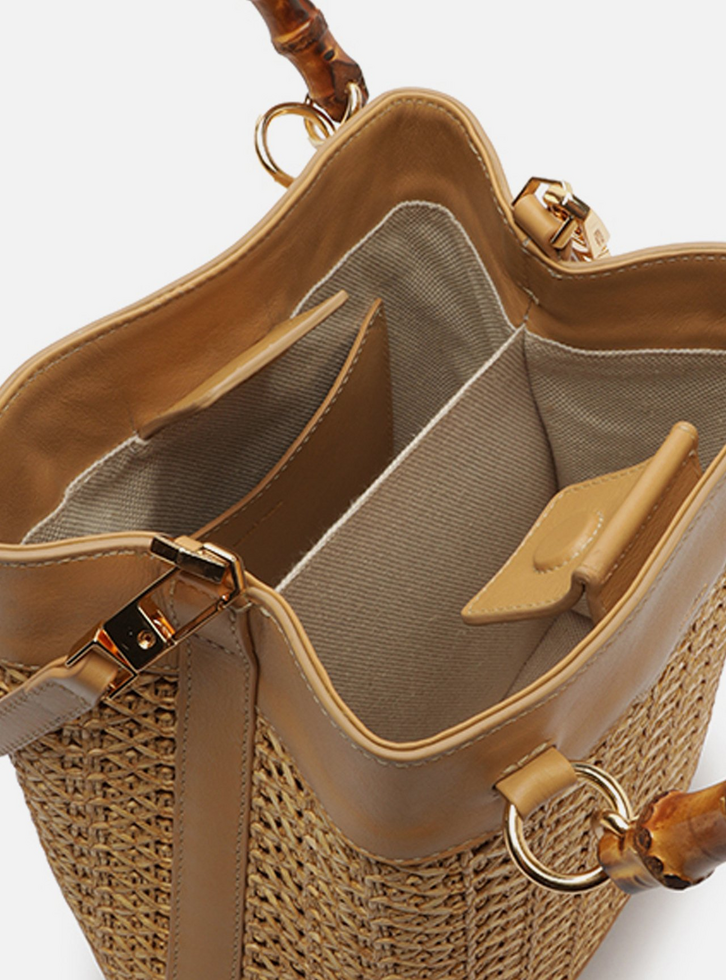Bolsa bucket média em palha natural e couro marrom claro. O acessório tem formato estruturado, com capas em palhinha tramada natural e moldura em couro marrom. Possui divisória interna que facilita a organização, além de alça lateral fina, regulável e removível. Conta também com alças de mão em bambu e fechamento superior em imã interno.