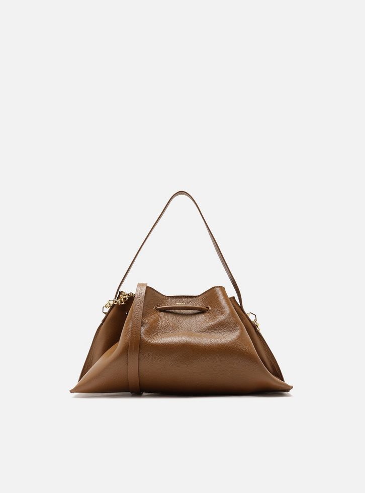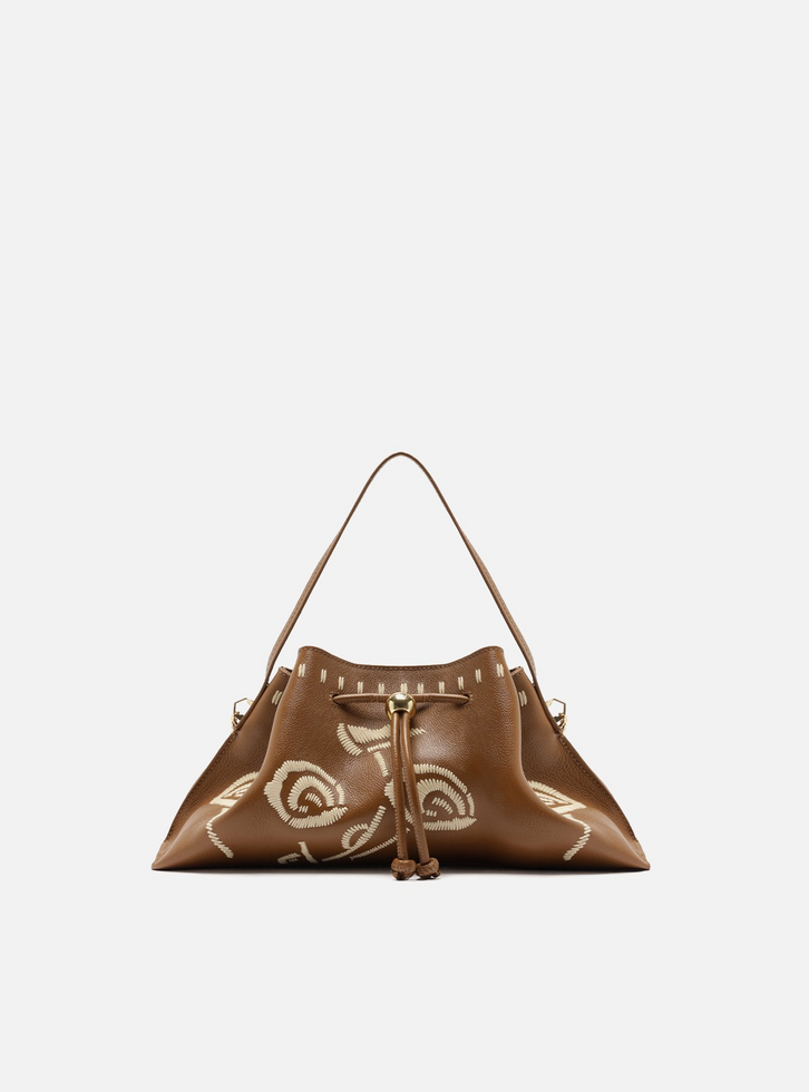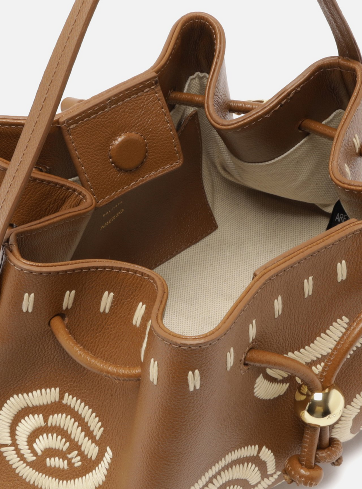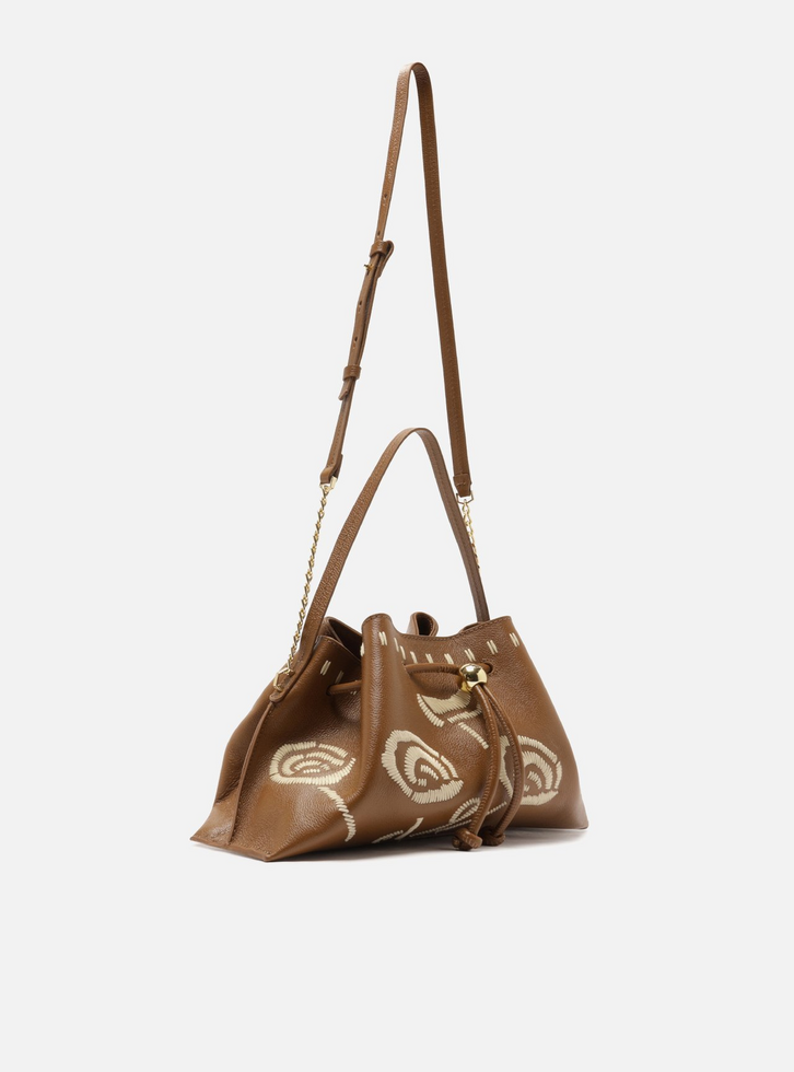 Bolsa bucket média marrom em couro. O acessório tem formato estruturado e acabamento macio. Traz alça de mão e alça tiracolo regulável com detalhe em corrente metálica. Possui bordado bege em forma de flores e detalhe riscado na parte superior. Conta com fecho em enforcador, com tiras de rolotê arrematadas por esfera metálica, além de imã interno.