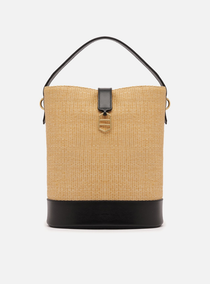 Bolsa bucket feminina média em palha natural com detalhes em couro preto. O acessório tem formato cilíndrico e estruturado, corpo em palha tramada e base em couro liso. Traz alça de mão e alça longa regulável e removível em couro preto, presas por metais dourados, além de tira superior em couro com imã e peça metálica geométrica. Possui interior forrado em linho.
