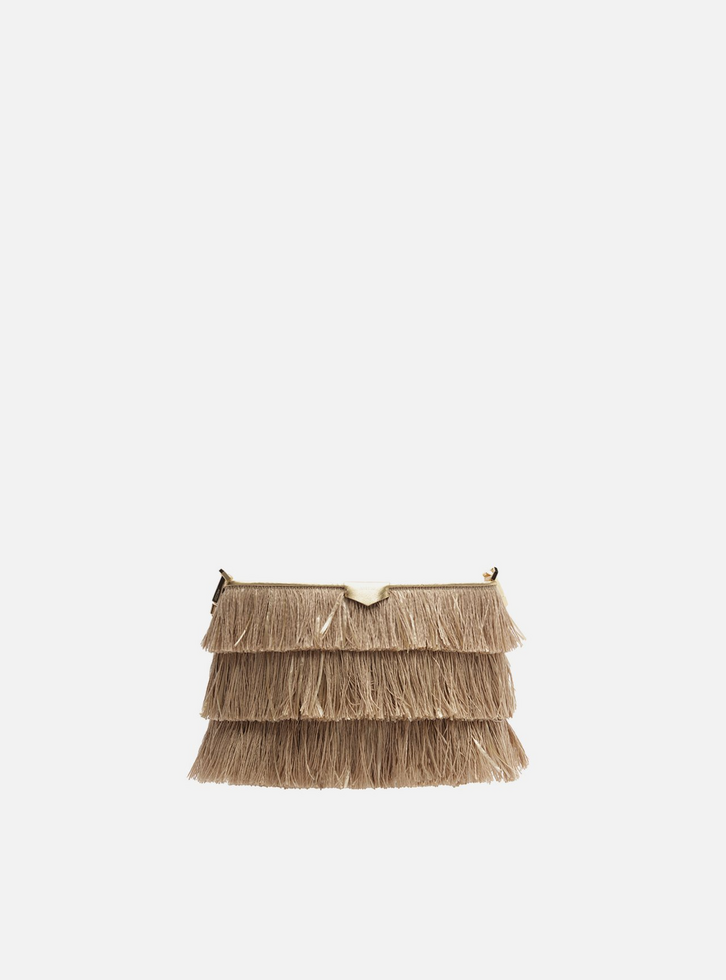 Bolsa clutch dourada de couro. O acessório tem formato retangular e estruturado. Traz capas com camadas de franjas longas, criando movimento e textura. Possui fecho superior em zíper e puxador, além de alça tiracolo lateral regulável e removível, que permite diferentes formas de uso.