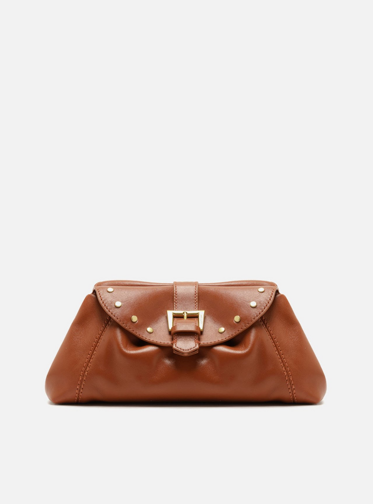 Bolsa clutch grande em couro laranja. O acessório tem formato alongado, acabamento macio e estrutura maleável. Traz tampo com aplicação de rebites metálicos no contorno e detalhe em tira com fivela metálica central. Possui fecho superior em imã interno e alça lateral fina, regulável e removível. Parte interna forrada.