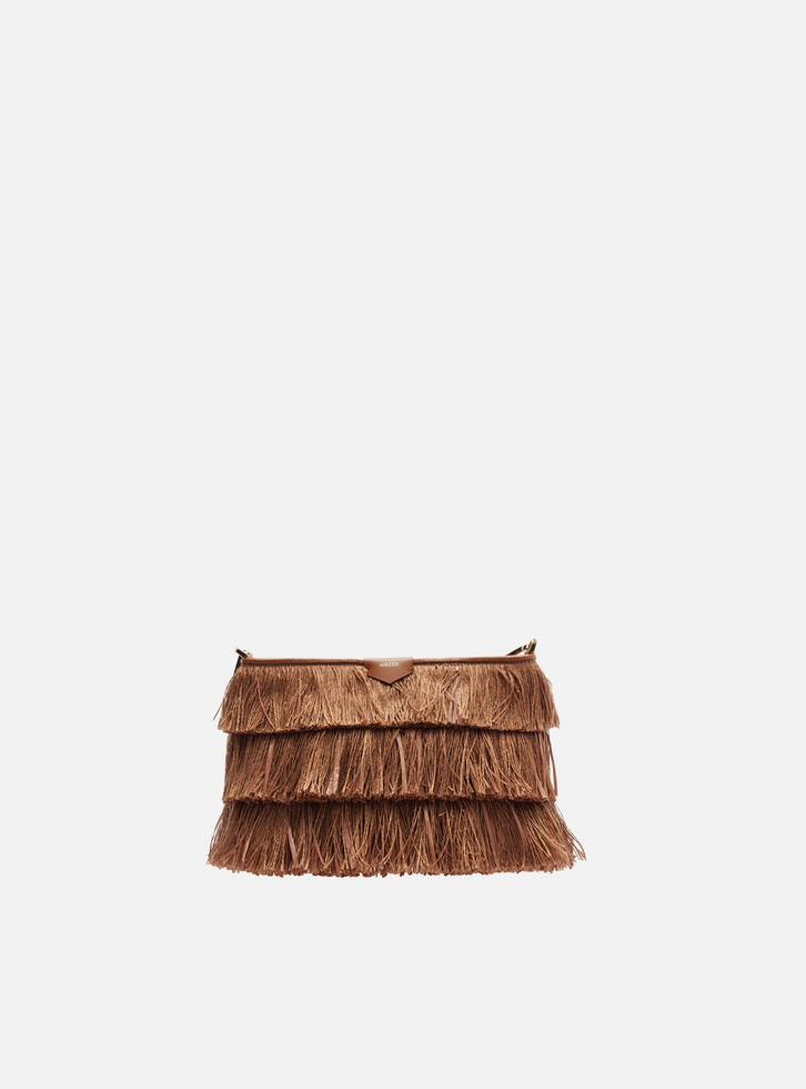 Bolsa clutch marrom de couro. O acessório tem formato retangular e estruturado. Traz capas com camadas de franjas longas, criando movimento e textura. Possui fecho superior em zíper e puxador, além de alça tiracolo lateral regulável e removível, que permite diferentes formas de uso.