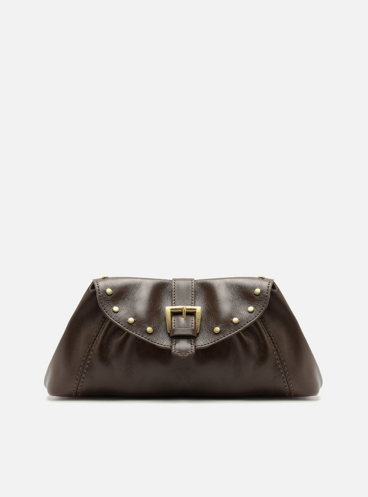 Bolsa clutch grande em couro marrom. O acessório tem formato alongado, acabamento macio e estrutura maleável. Traz tampo com aplicação de rebites metálicos no contorno e detalhe em tira com fivela metálica central. Possui fecho superior em imã interno e alça lateral fina, regulável e removível. Parte interna forrada.