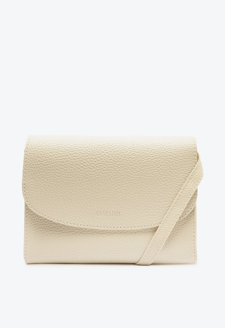 Bolsa crossbody Anacapri clássica na cor branca. De material similar ao couro, o modelo tem formato retangular estilo envelope, laterais arredondadas e acabamento texturizado. Traz alça transversal fina e fecho em tampo frontal com ímãs internos. Contornada em pespontos delicados, traz assinatura Anacapri em relevo na capa frontal.