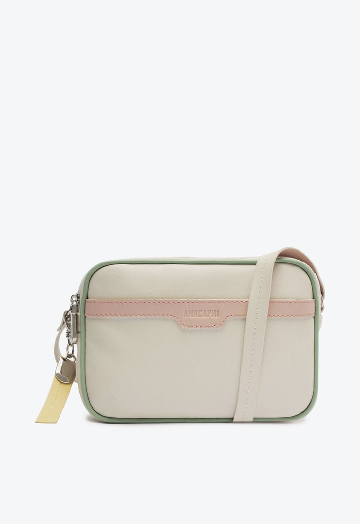 Bolsa crossbody Anacapri branca com detalhes multineutros. O modelo de tamanho médio traz shape clássico retangular com acabamento arredondado nos cantos. Traz alça longa transversal em em tira fina. Feita em material similar ao couro e ótimo compartimento interno com forro, apresenta duas divisórias com fechamento em zíper, um em cada extremidade da bolsa, com puxadores de metal exclusivos Anacapri. Apresenta bolso externo aberto e placa personalizada Anacapri em tira colorida contornada em pesponto delicado na capa frontal. Acompanha chaveiro exclusivo Anacapri. O acessório é removível e pode ser utilizado separadamente da bolsa.