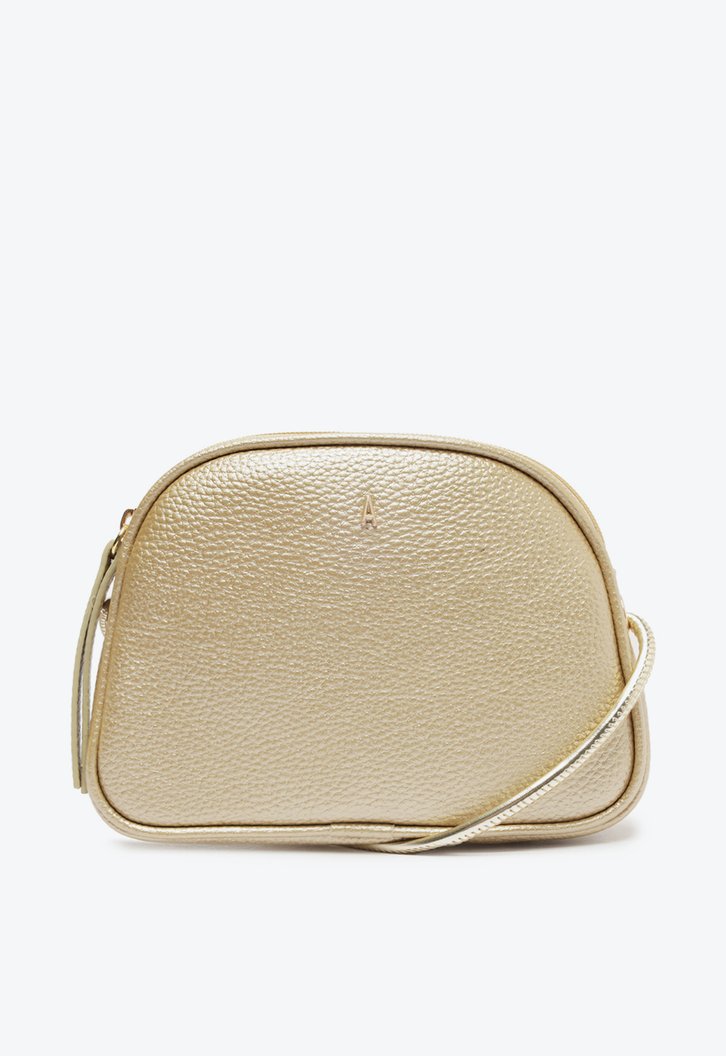Bolsa crossbody Anacapri dourada basic. De material similar ao couro com acabamento metalizado, a bolsa vem para a temporada em tamanho pequeno, com alça longa transversal. De shape arredondado, ela é forrada na parte interna, com fechamento superior em zíper com puxador em tira. O modelo traz nova assinatura exclusiva centralizada na capa frontal em aviamento metálico de mesmo tom da bolsa, com inscrição da inicial “A”, assinatura Anacapri.