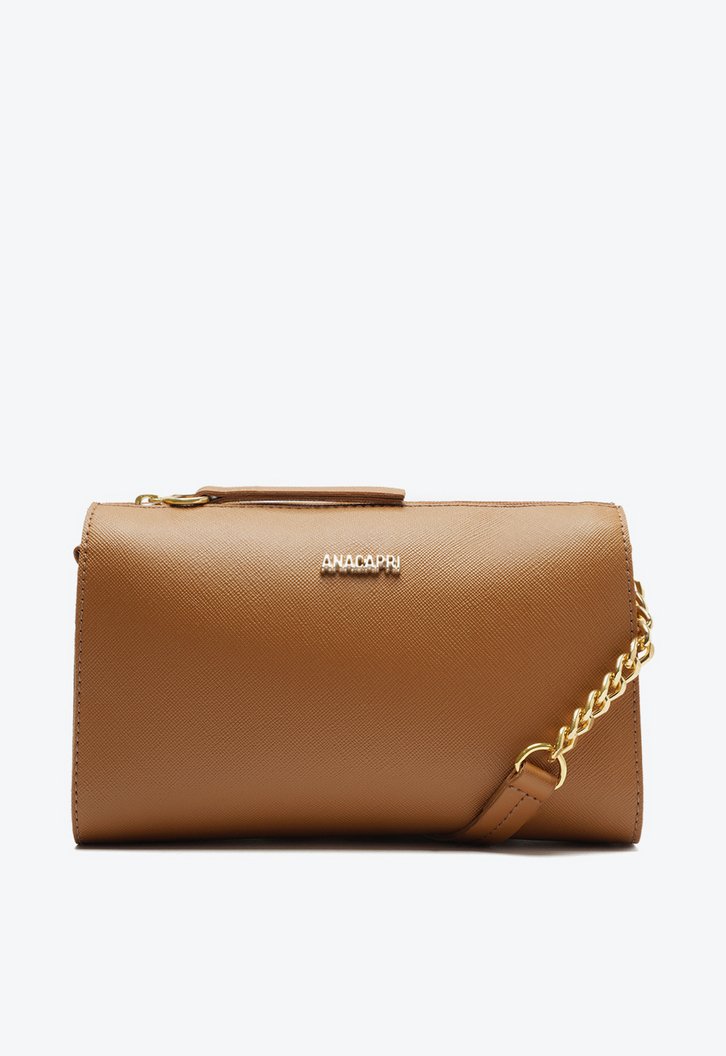 Bolsa crossbody Anacapri marrom. O modelo de tamanho médio possui shape moderno e estruturado, com acabamento em textura e envernizada. Possui alça longa a tiracolo com detalhe de aplicação de corrente metálica imponente. Possui fechamento superior em zíper com puxador em tira. Forrada na parte interna, traz aplicação de aviamento metálico com assinatura Anacapri na capa frontal.