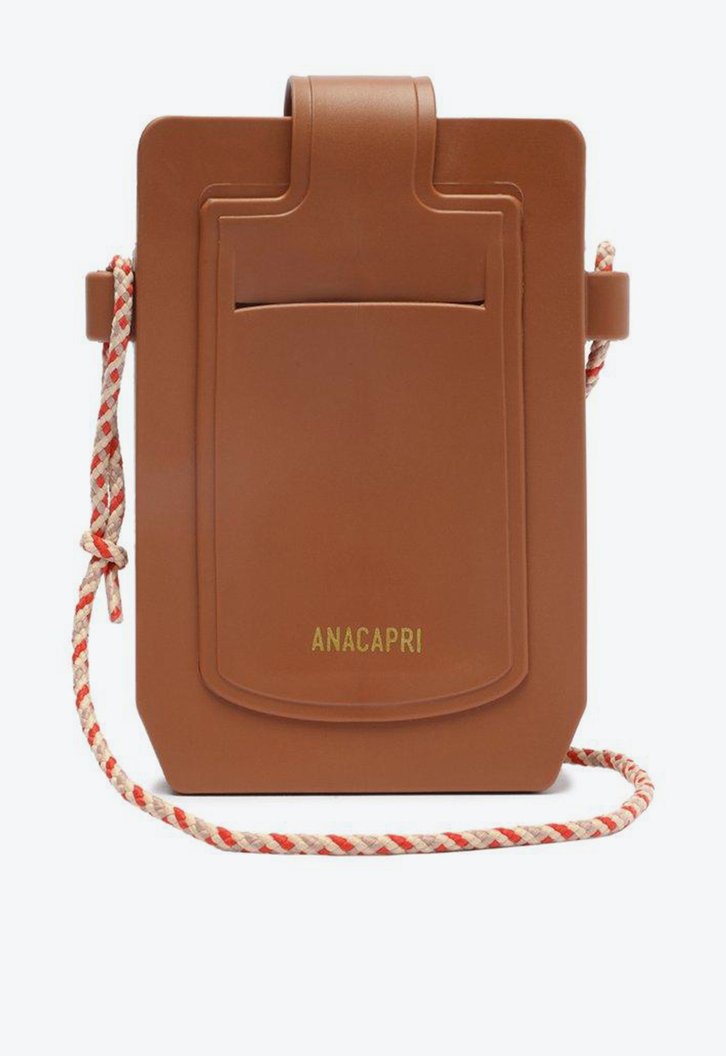 Bolsa crossbody porta celular marrom. Porta celular marrom em tamanho pequeno. Feita em plástico injetado de PVC com acabamento fosco. Com alça transversal em cordão colorido, com fecho de pressão frontal e assinatura com inicial A, do nome da marca, carimbado na tira. O modelo possui porta cartão nas costas, comporta celular e documentos.