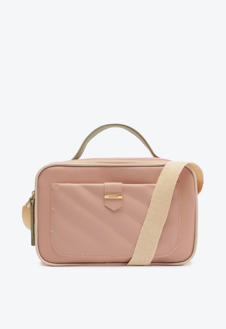 Bolsa crossbody Anacapri rosa. O modelo de tamanho grande traz shape retangular com acabamento arredondado nos cantos. Estilo camera bag - possui uma alça de mão reforçada e outra longa transversal em fita de gorgurão regulável. Feita em material similar ao couro e ótimo compartimento interno com forro, apresenta duas divisórias com fechamento em zíper, um em cada extremidade da bolsa, com puxadores em tira. Apresenta bolso externo com detalhe em costura matelassê em design de linhas cruzadas. Traz placa metálica personalizada com assinatura Anacapri no bolso da capa frontal.