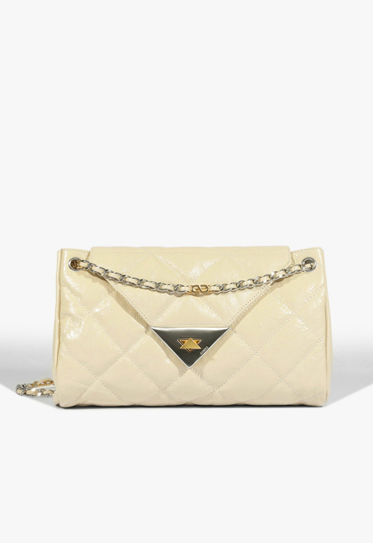 Bolsa tiracolo em material com brilho elegante e textura amassadinha, que dá um toque moderno e sofisticado ao visual. O modelo conta com fechamento em aba triangular com detalhe metálico dourado, que garante um toque de elegância extra. Versátil e estilosa, possui alça em corrente, ideal para compor produções tanto do dia a dia quanto da noite.