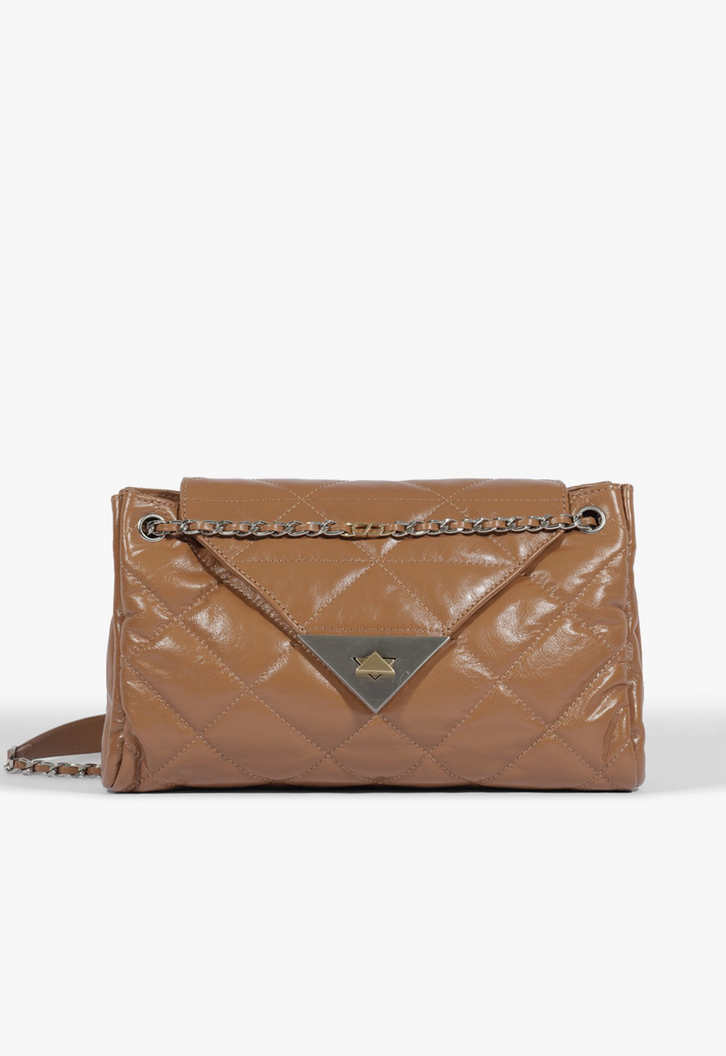 Bolsa tiracolo em material com brilho elegante e textura amassadinha, que dá um toque moderno e sofisticado ao visual. O modelo conta com fechamento em aba triangular com detalhe metálico dourado, reforçando sua elegância. Com alça em corrente, é a escolha perfeita para compor desde looks casuais até produções mais refinadas.