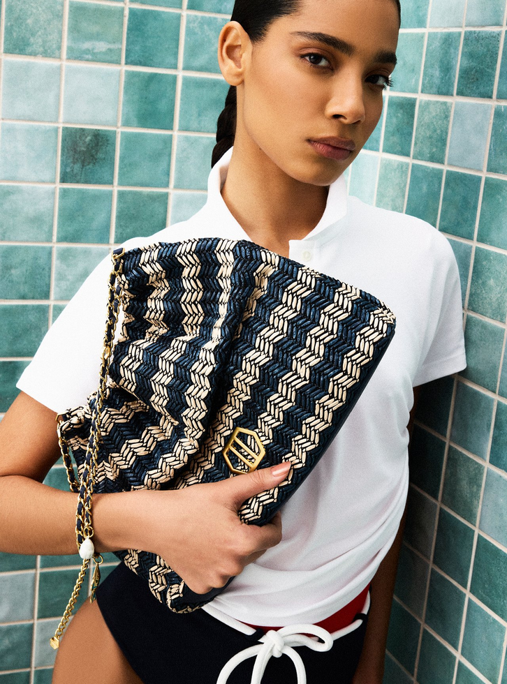 Bolsa hobo grande azul e bege em ráfia natural tramada. O acessório tem formato macio e amplo. Traz alça em corrente metálica dupla com tiras de couro entrelaçadas e detalhe em elos hexagonais, além de corrente simples com pingente e outros charms com temática marítima. Possui borda superior franzida e fecho em imã interno. Com peça de metal, dourada, geométrica e vazada aplicada na capa.