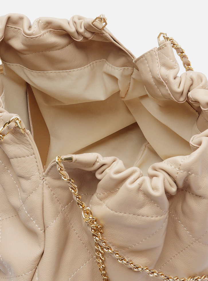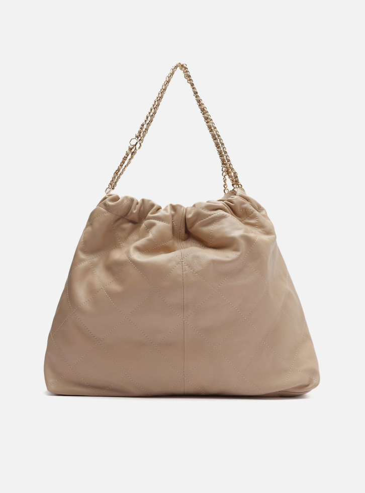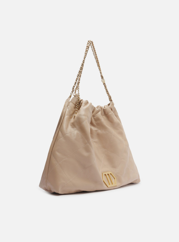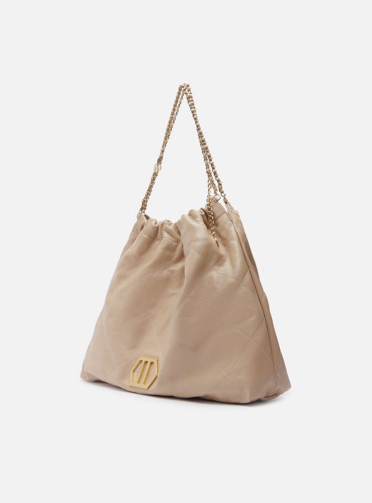 Bolsa hobo grande de couro bege. O acessório tem formato soft, acabamento com costuras em matelassê e aplicação de metal geométrico e vazado na capa. Traz alça de ombro ou tiracolo em correntes metálicas com detalhes em couro e pingente hexagonal com nome da marca. Com fecho superior em enforcador e imã interno.