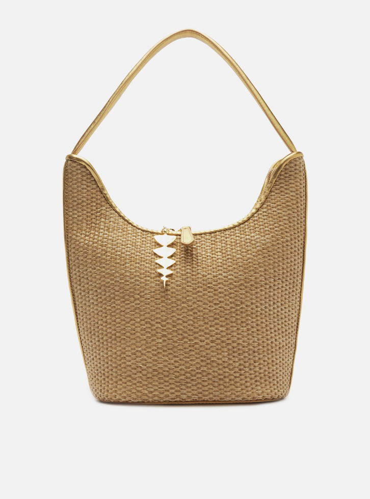 Bolsa hobo grande em palha natural. O acessório tem formato estruturado e acabamento tramado. Conta com contorno e detalhes em couro dourado. Possui fecho superior em zíper duplo com puxadores em tira e pingente metálico dourado com inspiração marítima. Traz alça larga e única de ombro, contínua ao corpo da bolsa.