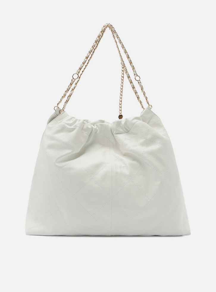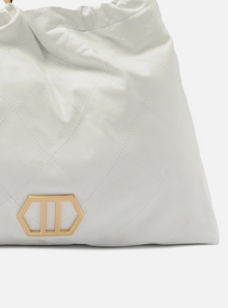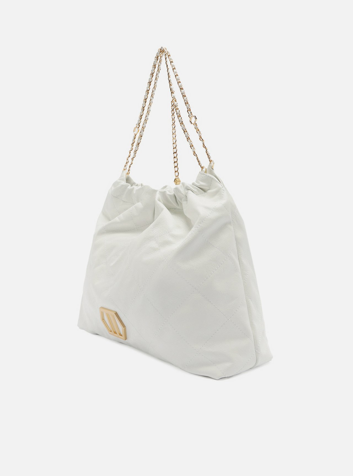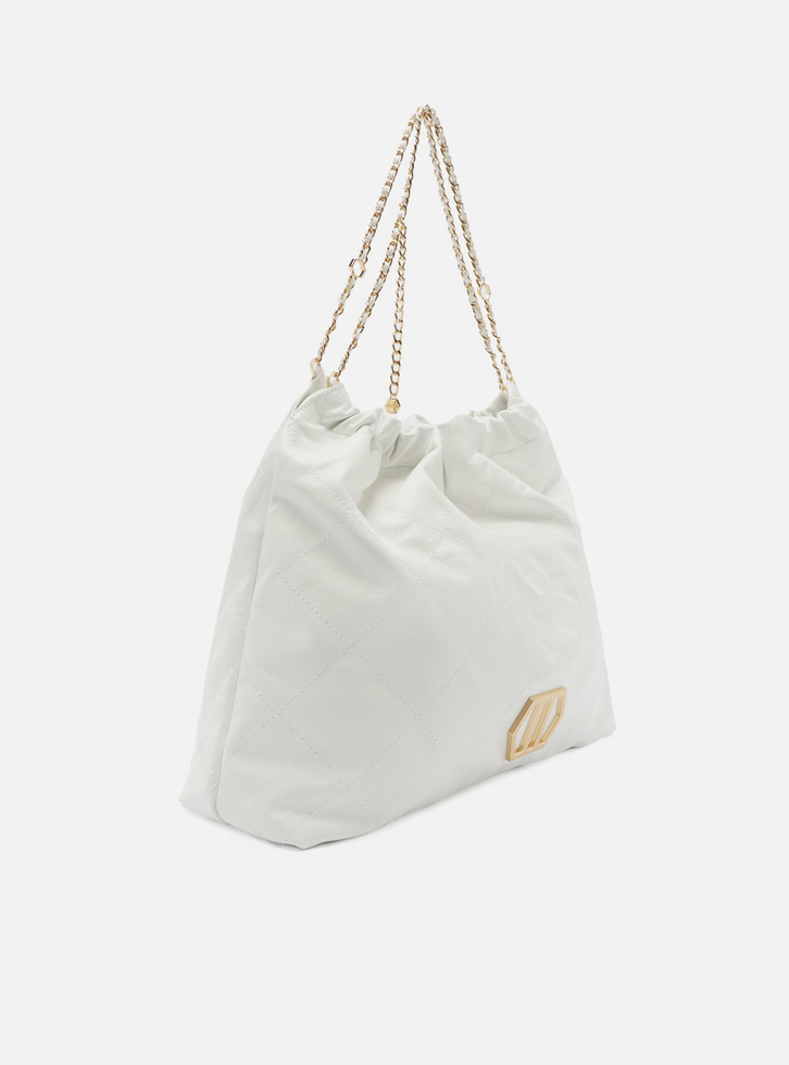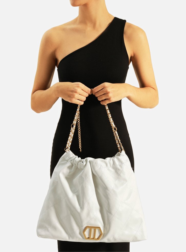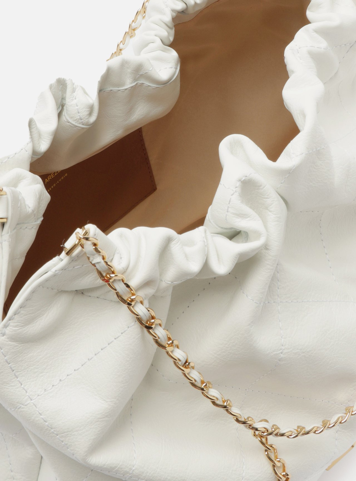 Bolsa hobo grande de couro branca. O modelo tem formato soft, acabamento com costuras em matelassê e aplicação de metal com ID da marca, geométrico e vazado na capa. Traz alça de ombro ou tiracolo em correntes metálicas com detalhes em couro e pingente hexagonal do nome da marca. Com fecho superior e imã interno.