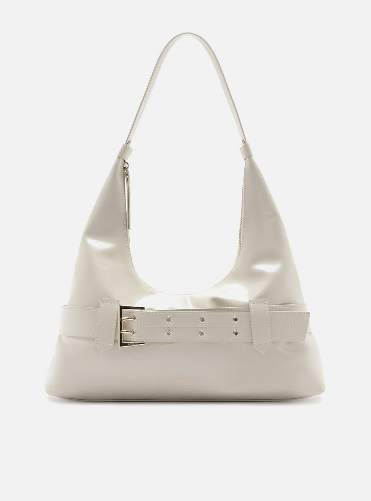 Bolsa hobo grande branca. O acessório tem formato amplo e acabamento envernizado. Traz alça contínua de ombro com conectores em metal nas laterais e detalhe frontal com tira larga e fivela dupla metálica, além de passadores. Possui fecho superior em zíper com puxador e inscrição discreta do nome da marca na parte frontal.