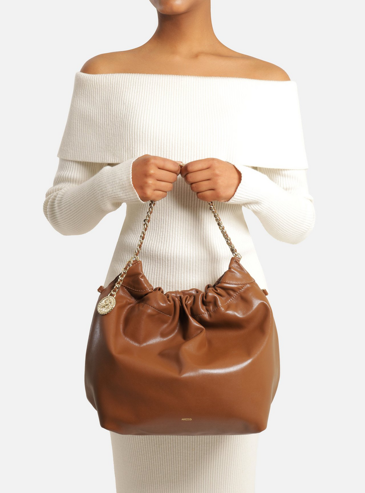Bolsa hobo grande marrom de couro. O acessório tem laterais arredondadas e acabamento macio. Traz alça curta de ombro em corrente metálica dupla com tiras de couro entrelaçadas e alça lateral em corrente com ombreira de couro. Possui fecho superior em imãs. Com metal dourado, em formato de moeda, preso à bolsa.