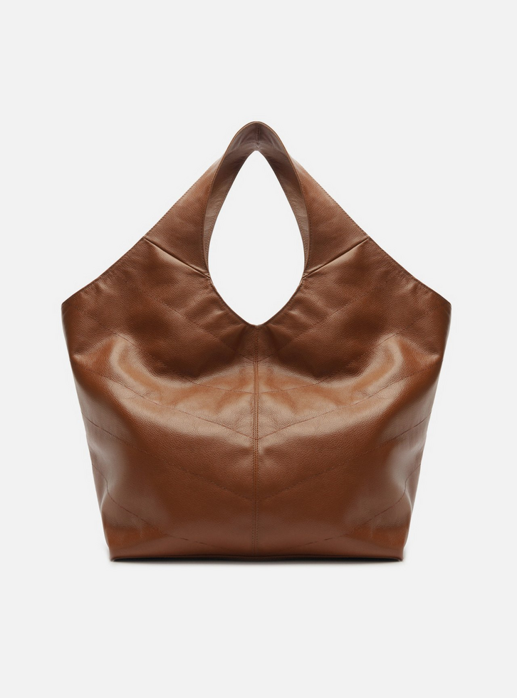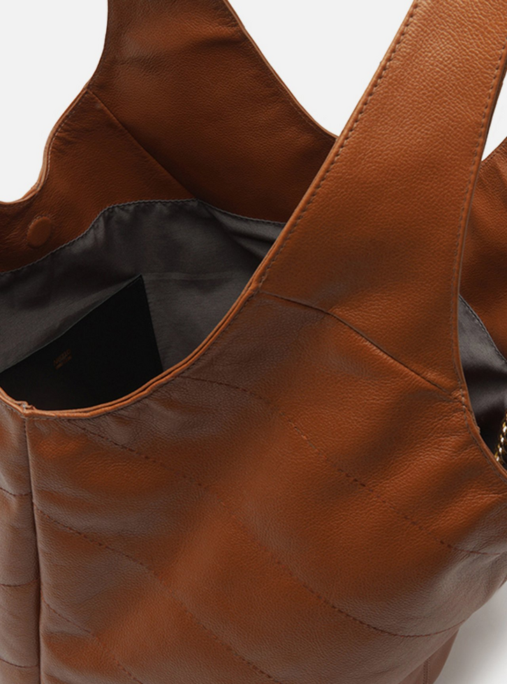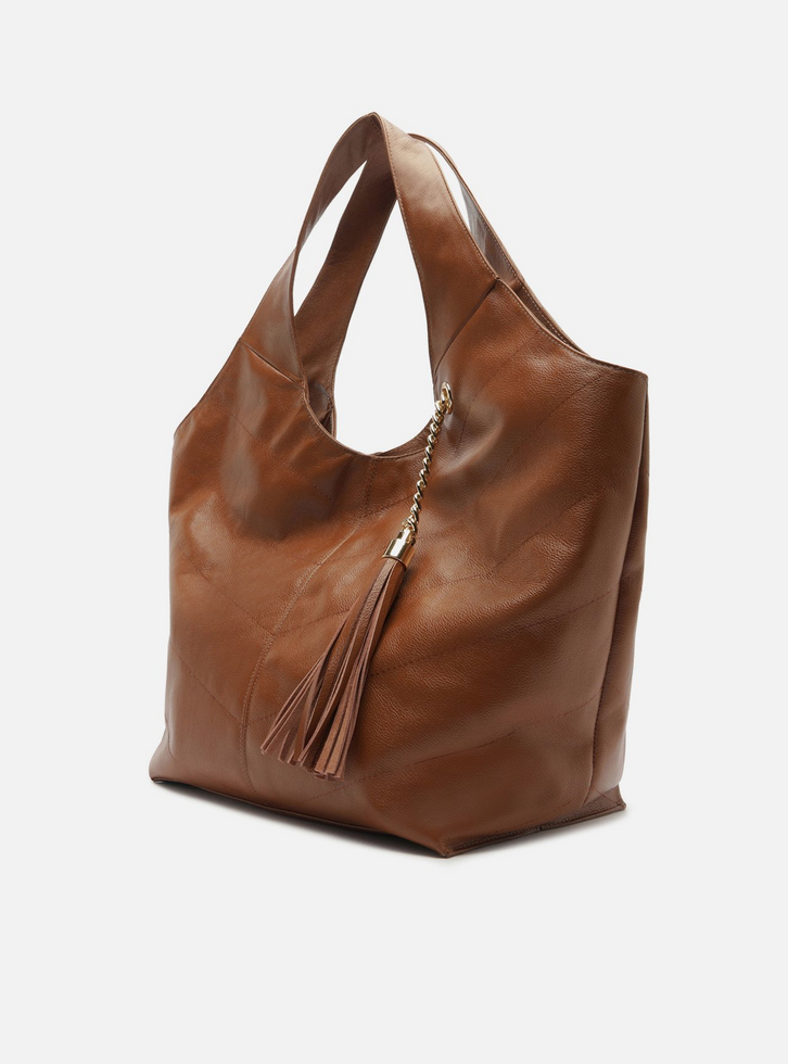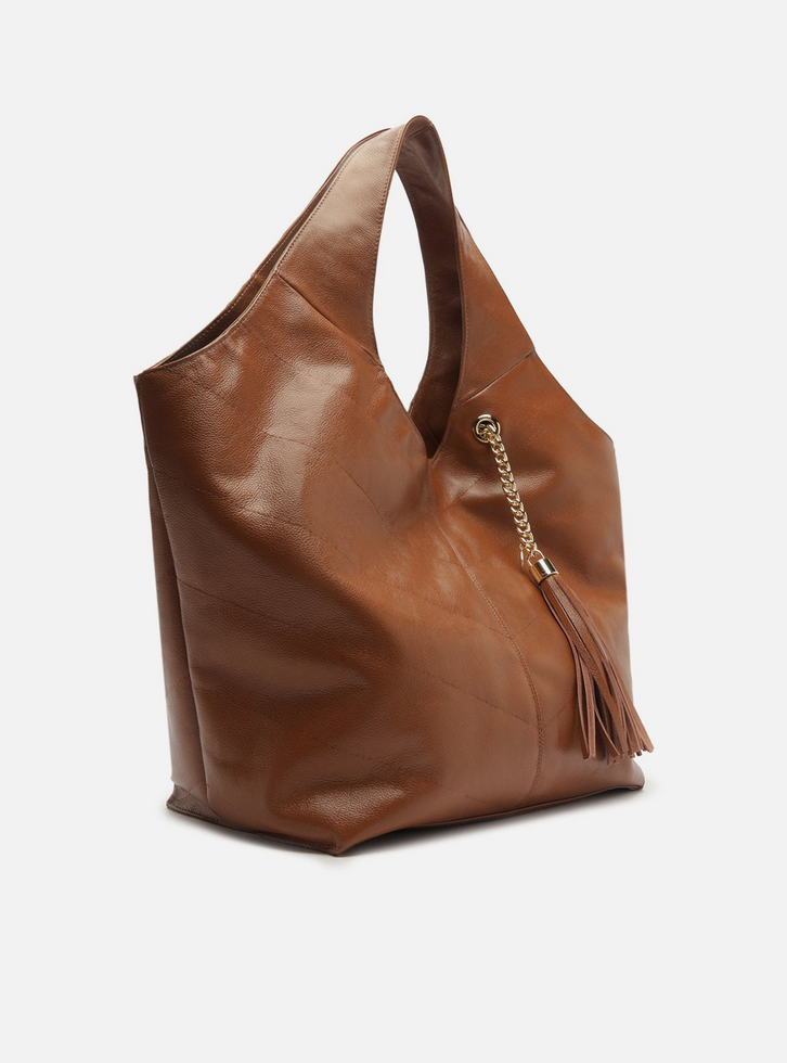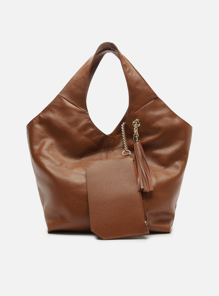 Bolsa hobo grande de couro marrom. O acessório tem formato soft e costuras pesponto nas capas e emendas. Traz alças de ombro largas e contínuas à bolsa, além de fecho em imã. Detalhe em bag charm de barbicacho com corrente metálica, preso à bolsa por ilhós vazado na capa. Acompanha pouch interna.
