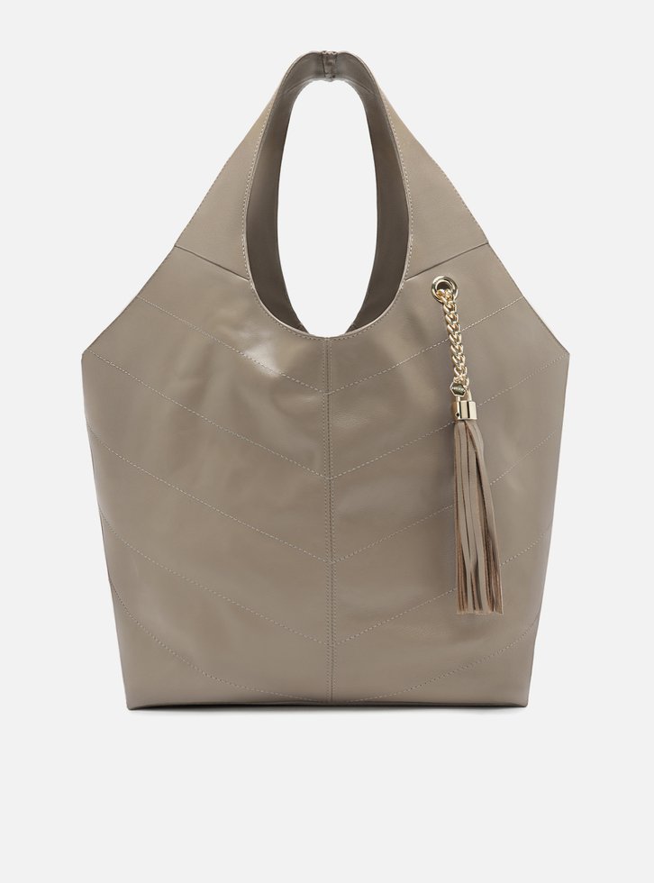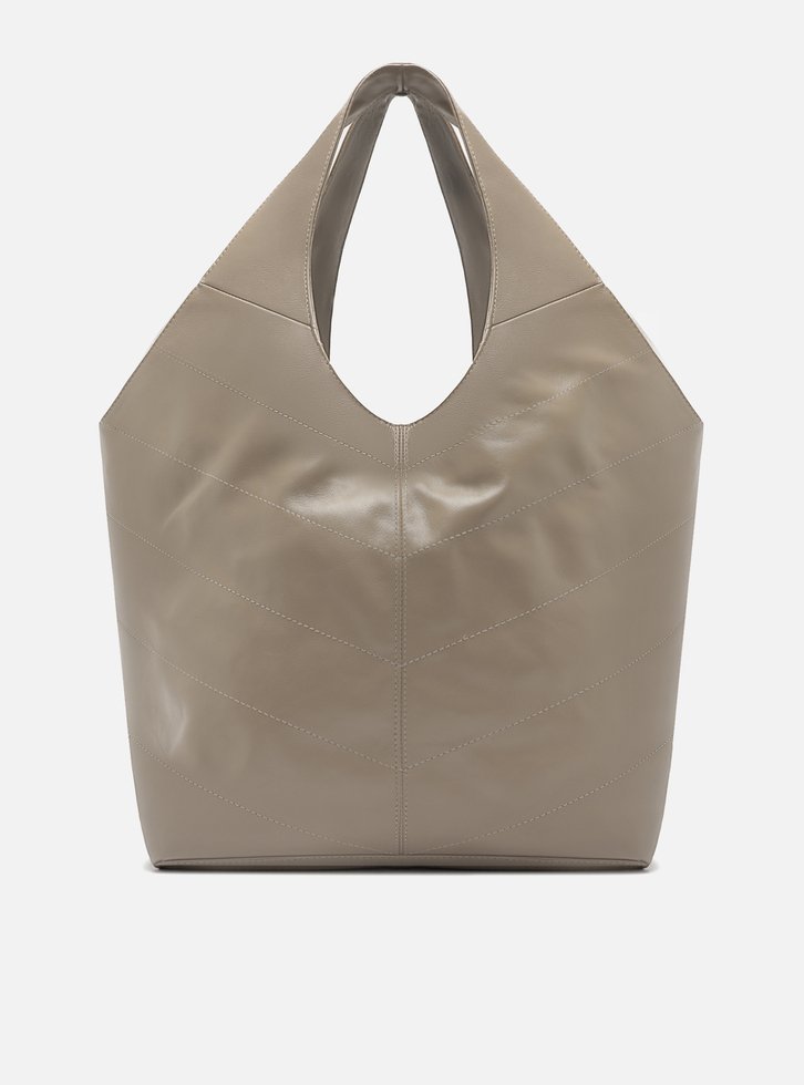 Bolsa hobo grande em couro cinza. O acessório tem formato amplo, maior na parte superior, e acabamento macio. Traz alça de ombro larga e contínua ao corpo da bolsa, além de costuras pesponto nas capas. Possui fecho em zíper e puxador. Com detalhe em barbicacho, tira em corrente com pingente e preso à bolsa por ilhós na capa.