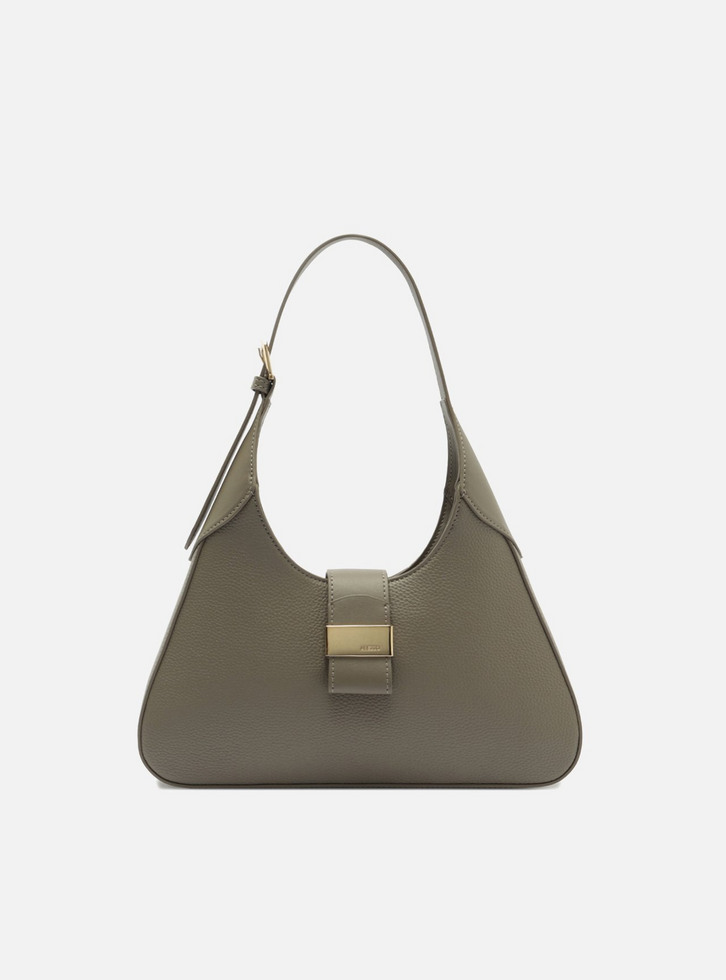 Bolsa feminina hobo cinza média. O acessório possui formato triangular e base levemente estruturada, traz alça de ombro de espessura fina, ajustável por fivela. O modelo tem fechamento central com tira que passa por uma fivela metálica retangular dourada, com inscrição do nome da marca.
