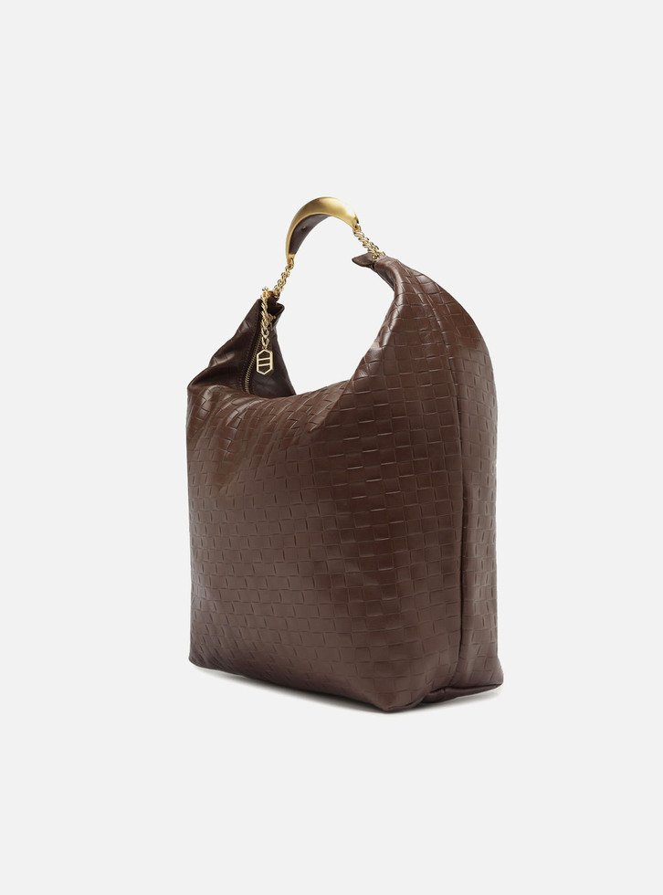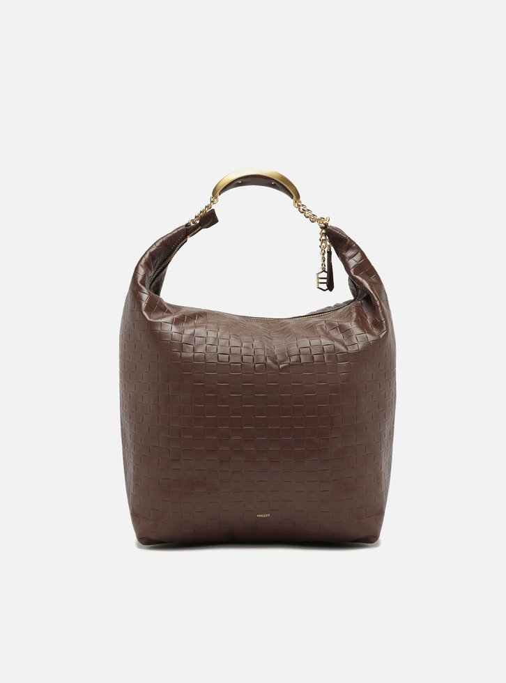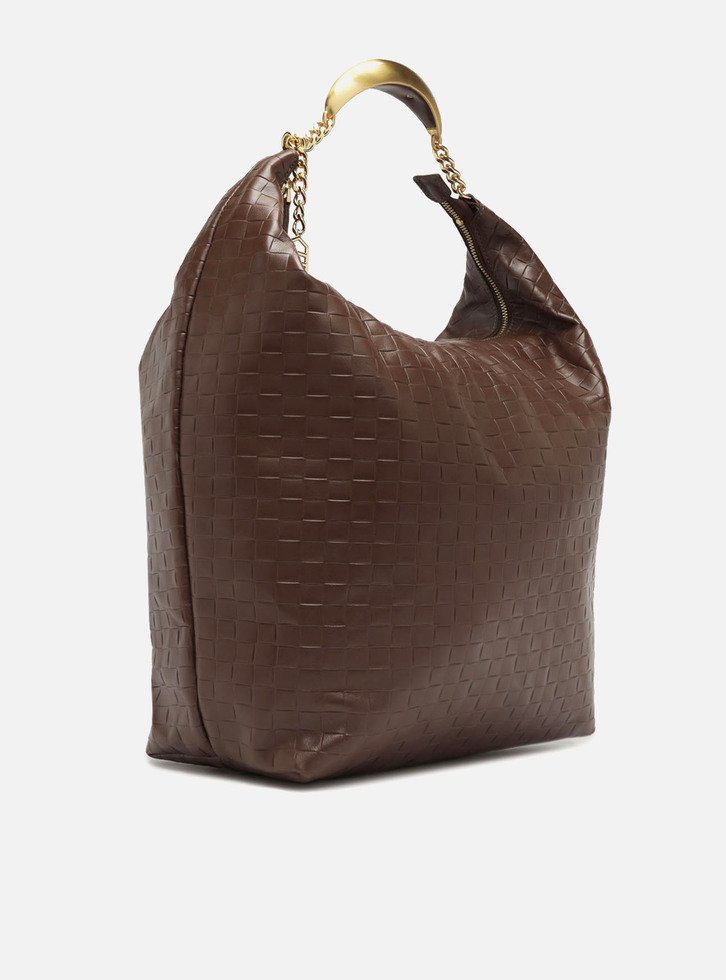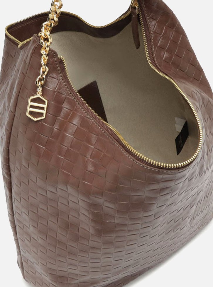 Bolsa hobo grande de couro marrom. O acessório tem formato estruturado e acabamento em tressê. Traz alça em metal dourado, espesso e orgânico, com interno forrado em couro e espuma, presa à bolsa na parte superior. Possui fecho em zíper e bag charm em corrente com peça de metal geométrica e vazada.