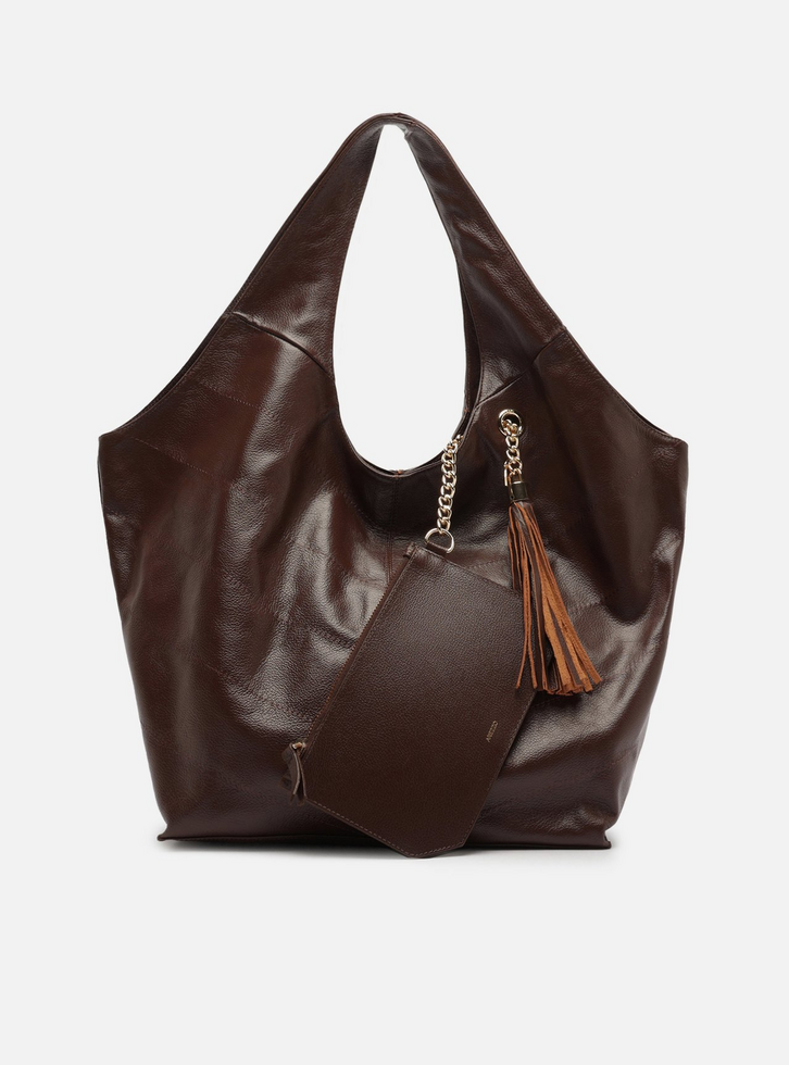 Bolsa hobo grande de couro marrom. O acessório tem formato soft e costuras pesponto nas capas e emendas. Traz alças de ombro largas e contínuas à bolsa, além de fecho em imã. Detalhe em bag charm de barbicacho com corrente metálica, preso à bolsa por ilhós vazado na capa. Acompanha pouch interna.