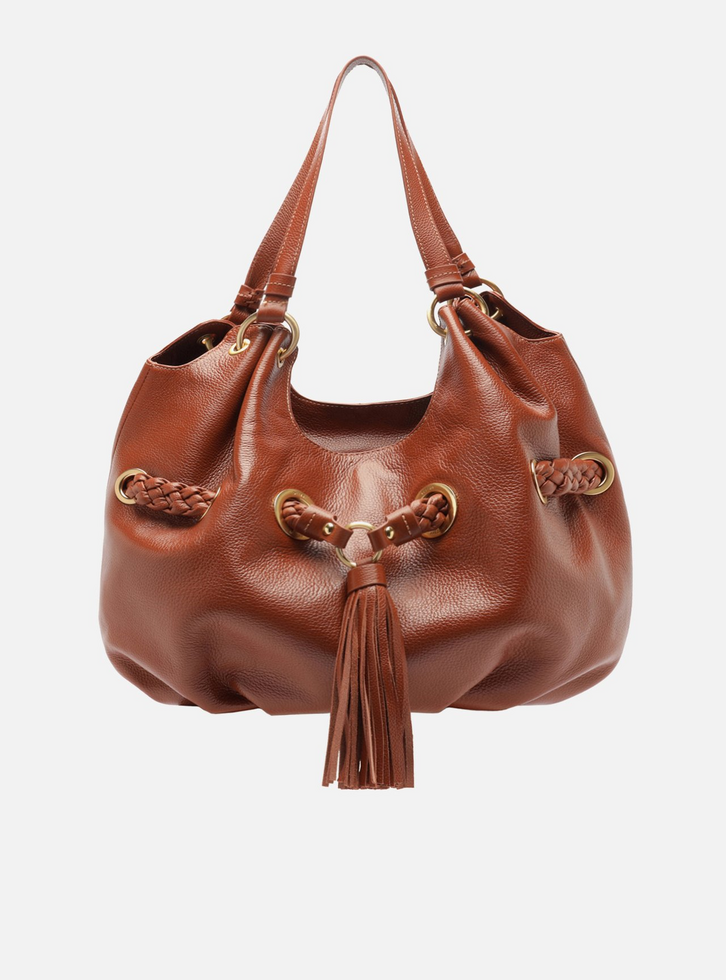 Bolsa feminina hobo grande em couro marrom. O acessório tem formato maleável e acabamento texturizado. Possui duas alças de ombro presas por argolas e ilhoses metálicos, além de recorte em U na parte superior e fecho por ímã interno. Traz detalhe em tira trançada, que passa por ilhoses aplicados nas capas e termina em barbicacho de camurcina na parte frontal.