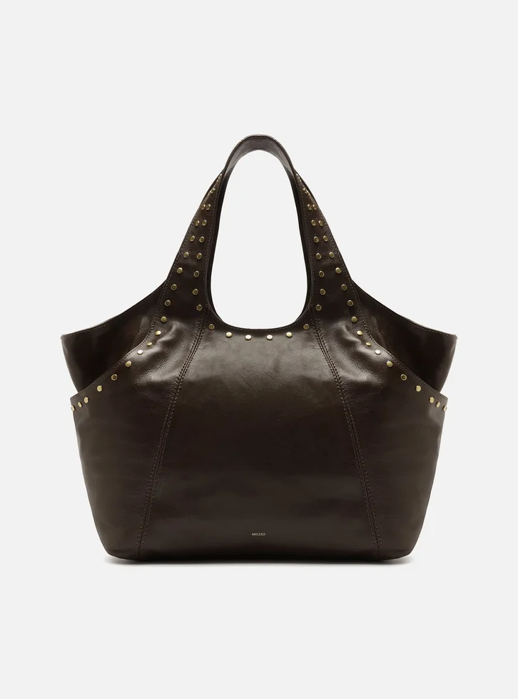 Bolsa hobo grande em couro marrom. O acessório tem formato amplo, acabamento macio e estrutura maleável. Traz recortes nas laterais com efeito de sobreposição e aplicação de rebites metálicos em todo o contorno superior. Possui alças contínuas ao corpo da bolsa, fecho em imã e parte interna forrada.