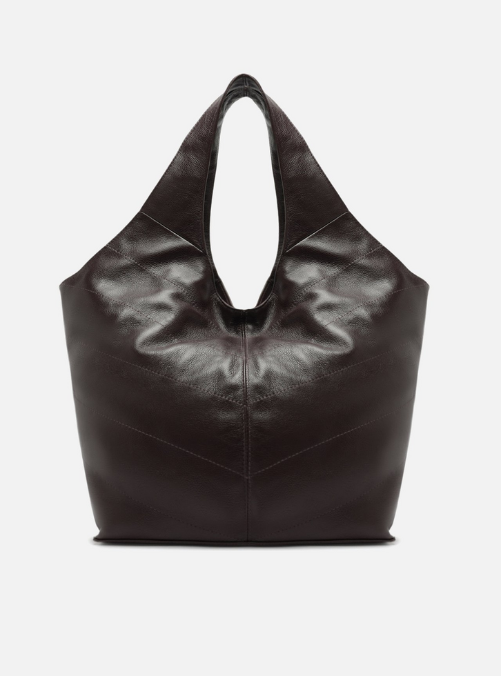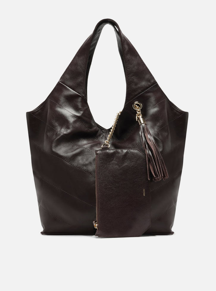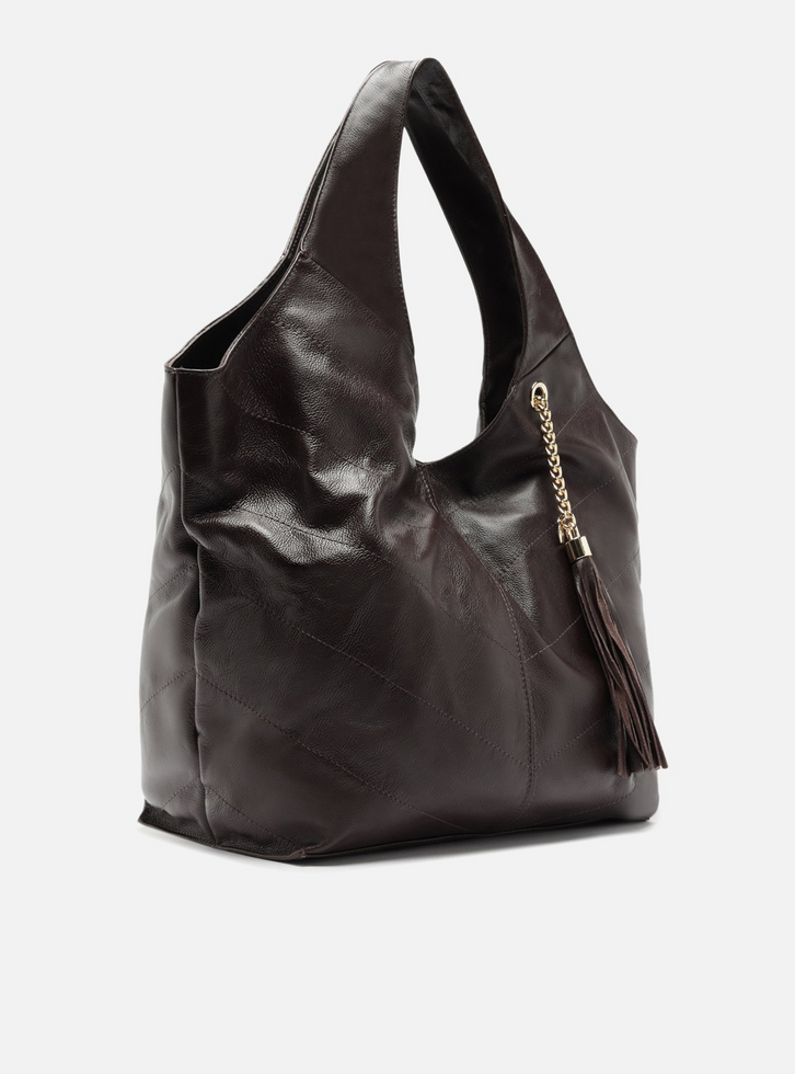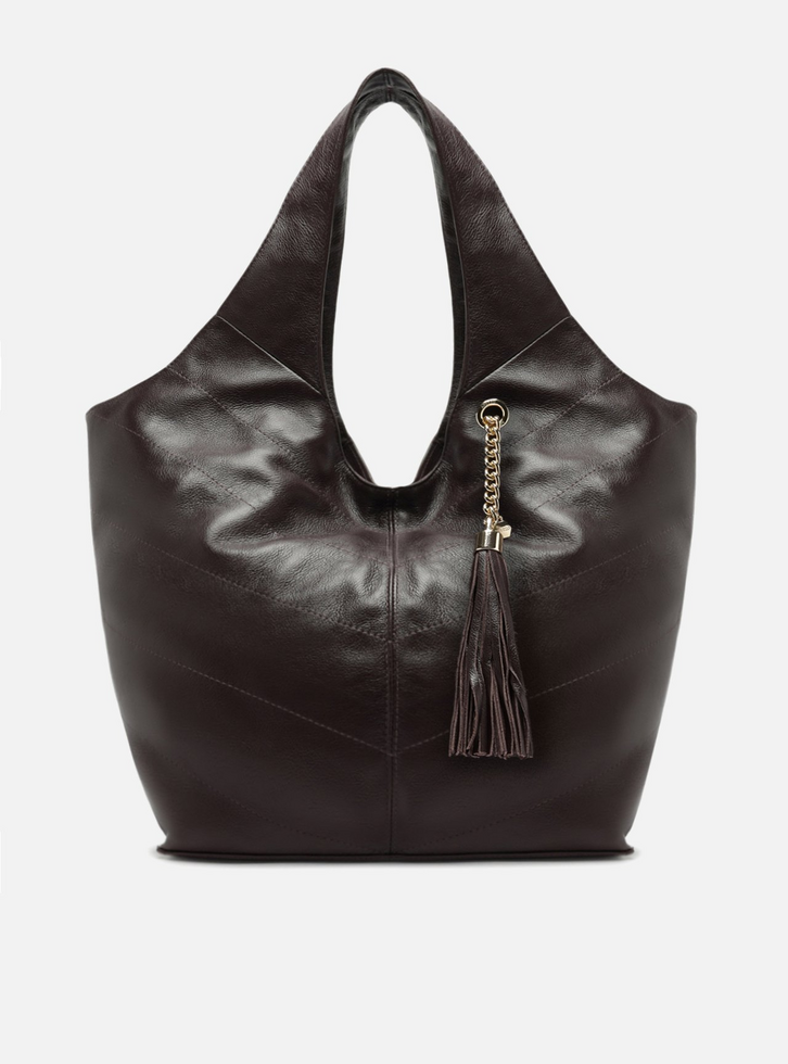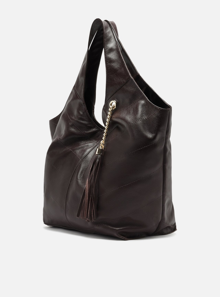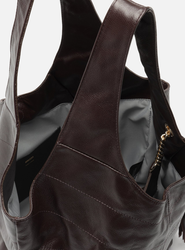 Bolsa hobo grande em couro marrom. O acessório tem formato amplo, maior na parte superior, e acabamento macio. Traz alça de ombro larga e contínua ao corpo da bolsa, além de costuras pesponto nas capas. Possui fecho em zíper e puxador. Com detalhe em barbicacho, tira em corrente com pingente e preso à bolsa por ilhós na capa.