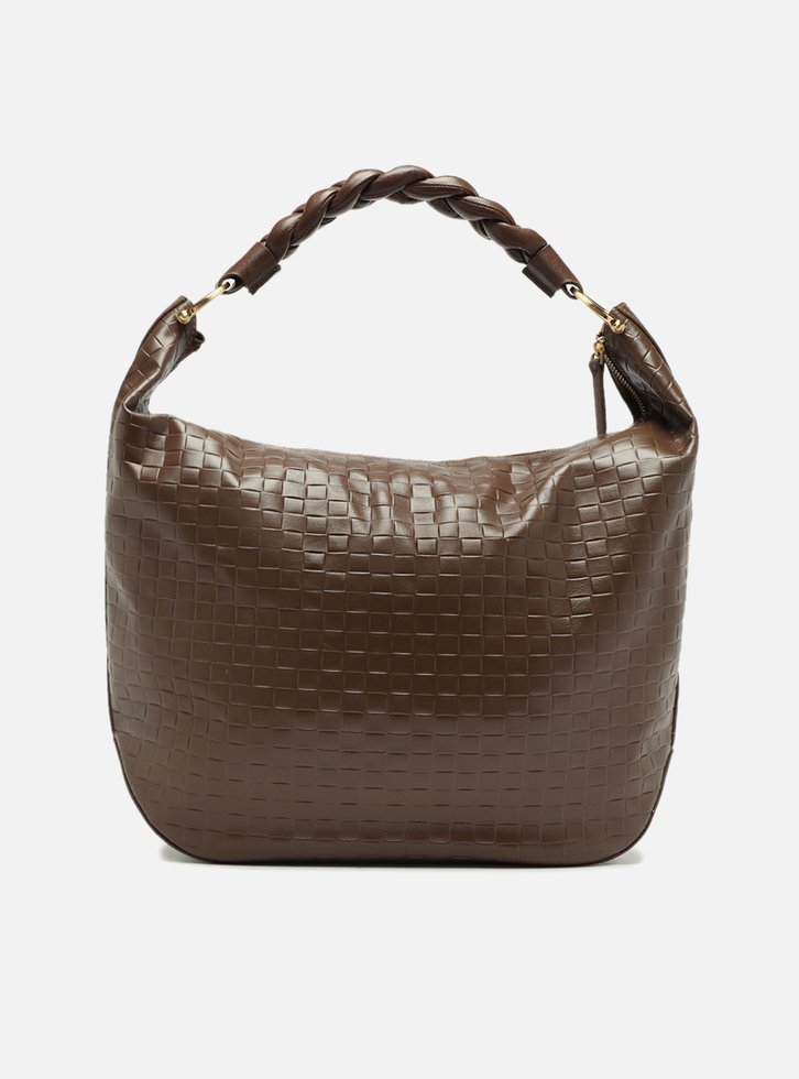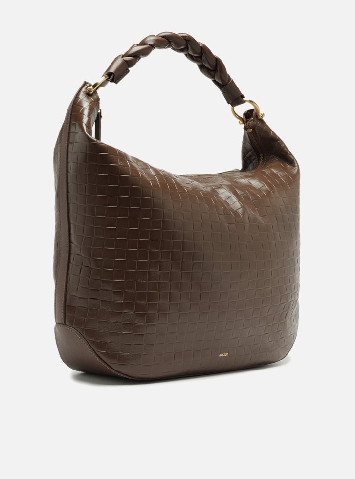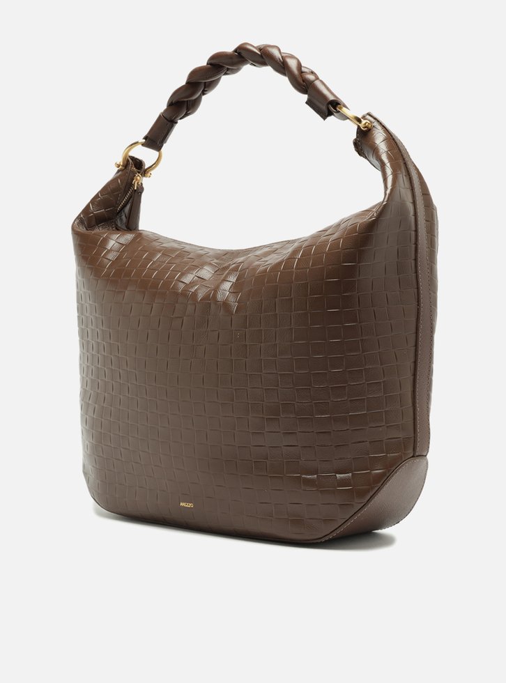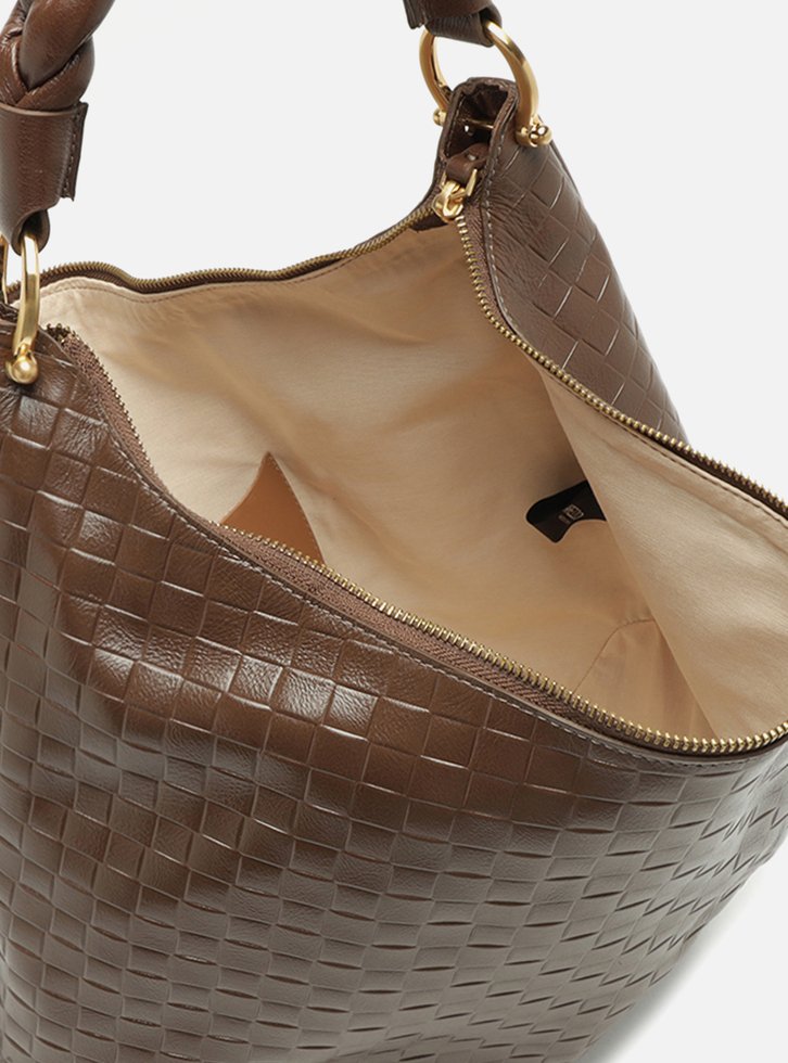 Bolsa hobo grande de couro marrom. O acessório tem formato soft e acabamento em tressê. Traz alça curta em tiras trançadas. Possui fecho em zíper e puxador em tira. Com inscrição discreta do nome da marca na capa.