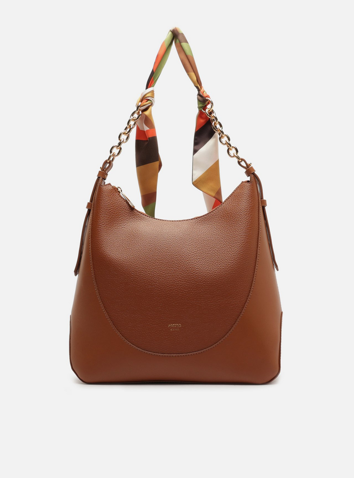 Bolsa hobo grande marrom. O acessório tem formato estruturado e acabamento texturizado. Traz moldura lisa e curva na base, além de alça contínua em corrente metálica dourada que abre no centro. A bolsa pode ser usada de duas formas: apenas com a corrente metálica ou com o lenço estampado que acompanha o modelo, amarrado à alça. Possui fecho superior em zíper com puxador.