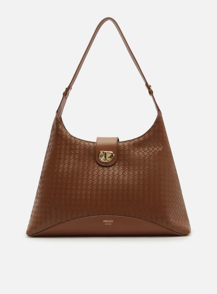 Bolsa hobo grande marrom. O acessório tem formato estruturado e acabamento em tressê nas capas. Traz alça única de ombro e fecho superior em zíper. Possui encaixe frontal em lapela e peça metálica com formato orgânico.