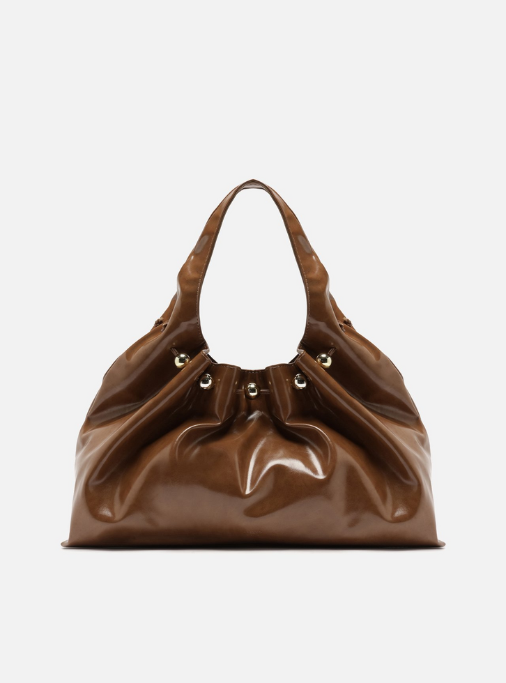 Bolsa hobo grande marrom em material com acabamento envernizado. O acessório tem formato macio. Traz alça de ombro/mãos larga e contínua ao corpo da bolsa. Possui parte superior com tira transpassada, estilo enforcador, com aplicação de esferas metálicas.