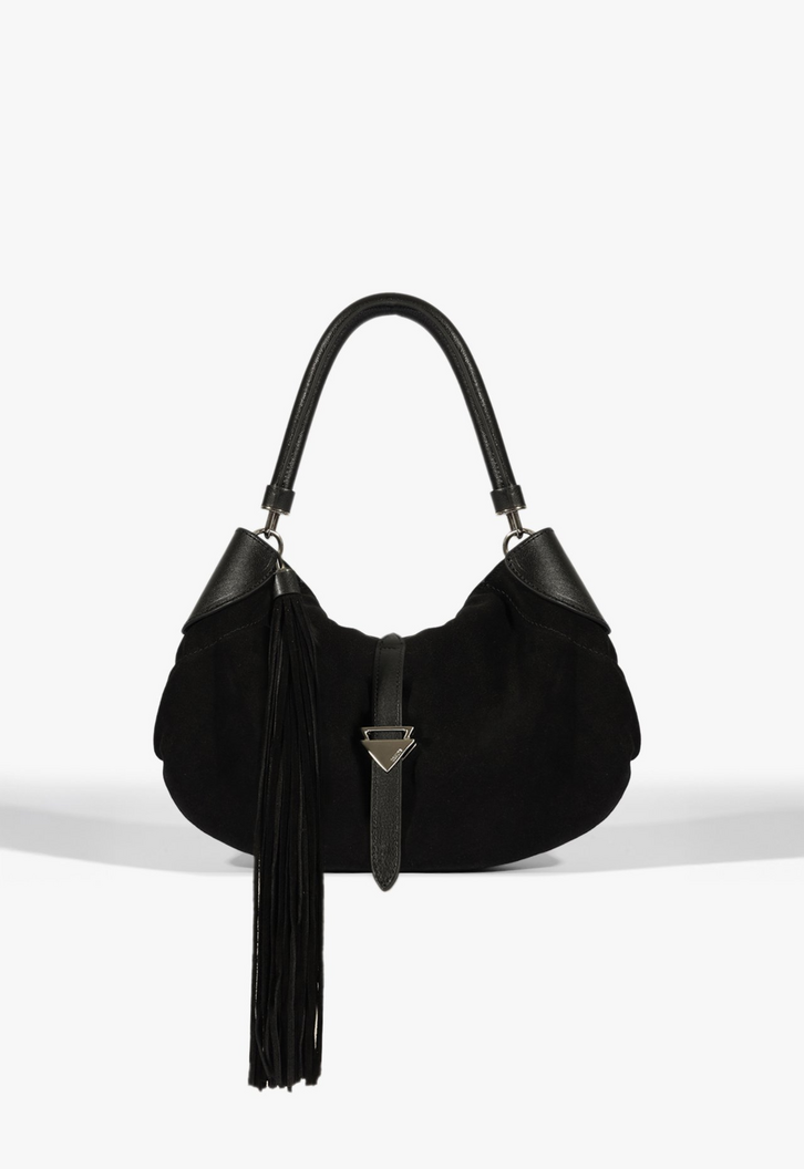 Com um visual cool e cheio de personalidade, esta bolsa preta em camurça aposta em uma construção soft e desabada que traz personalidade e estilo ao look. O destaque fica por conta do longo barbicacho com franjas que adiciona movimento e atitude. A lapela com metal em formato de triângulo e os metais personalizados reforçam a identidade Schutz com sofisticação. Com ótimo espaço interno é aquele modelo trendy perfeito para dar um toque marcante às suas produções. Aposte! Comprimento da alça: 22 cm | Largura da alça: 2 cm