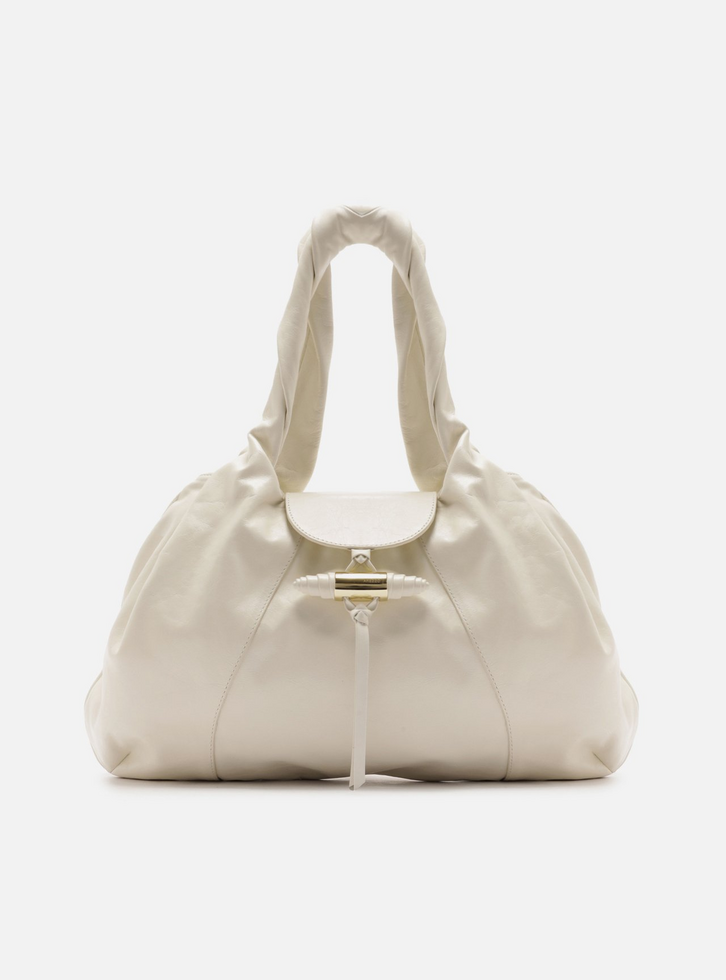 Bolsa maleável na cor branca, confeccionada em couro liso. Possui alça de ombro torcida. O fechamento principal é feito por uma aba que se sobrepõe e se prende por um fecho em formato de bastão dourado, com uma tira fina e pingente que decora a parte frontal.