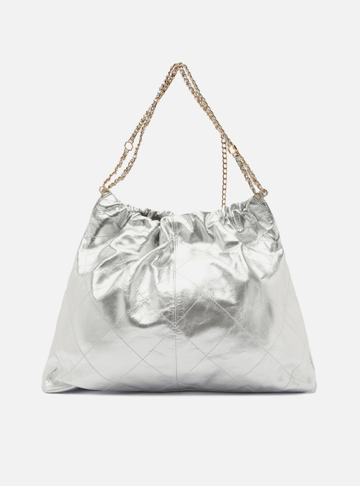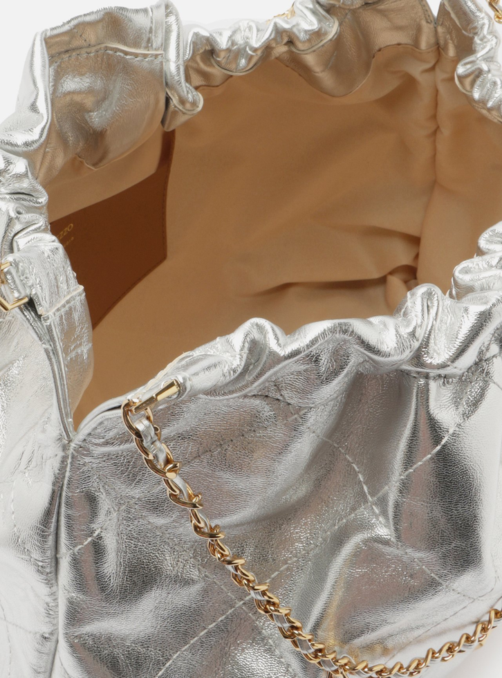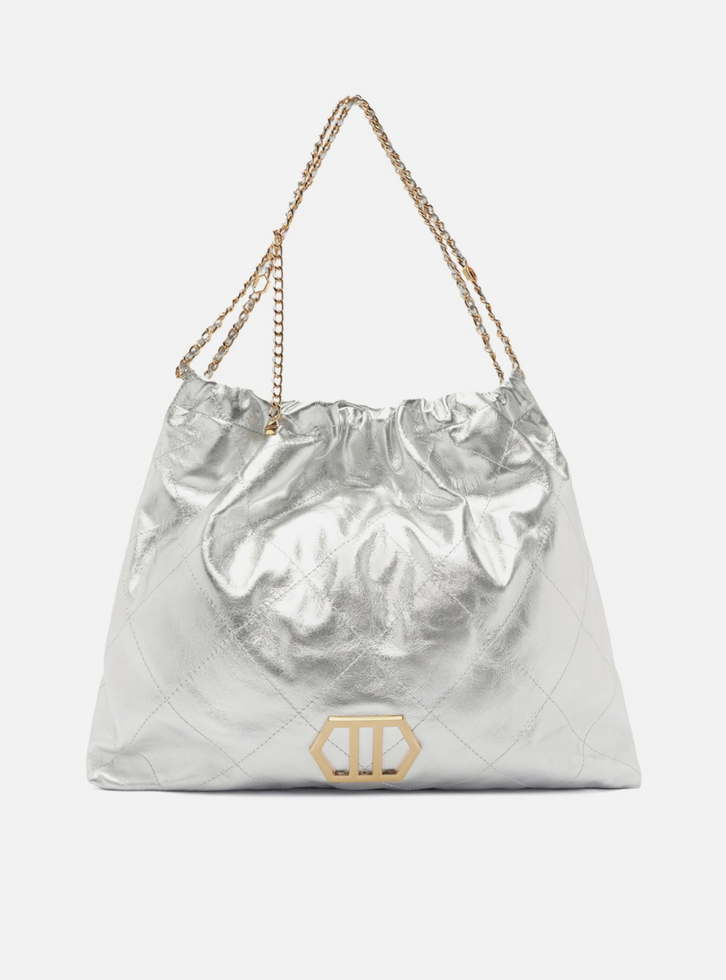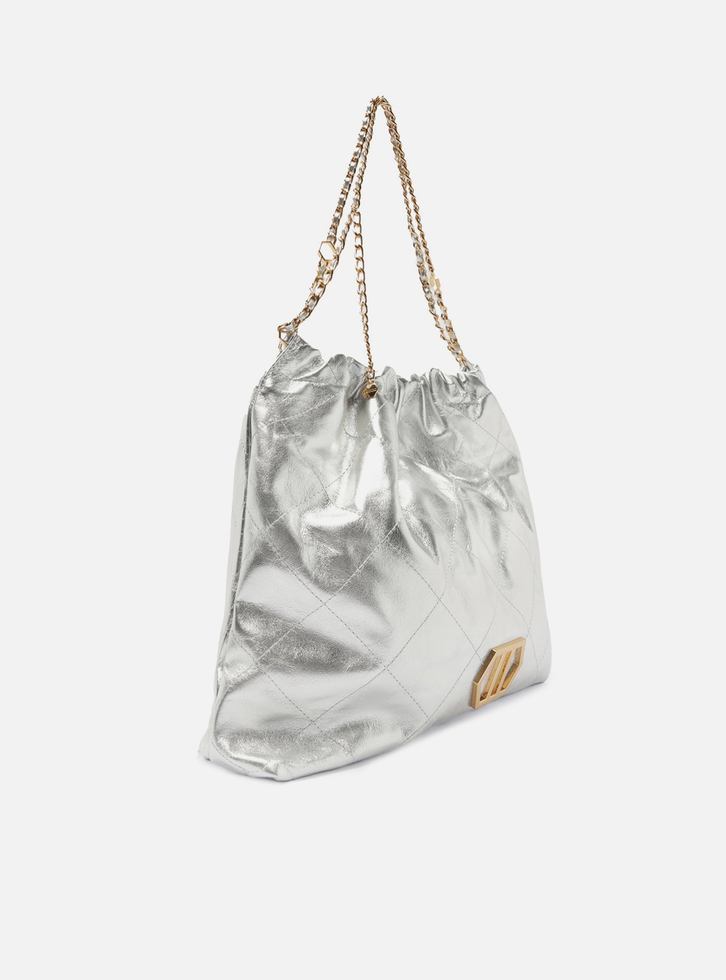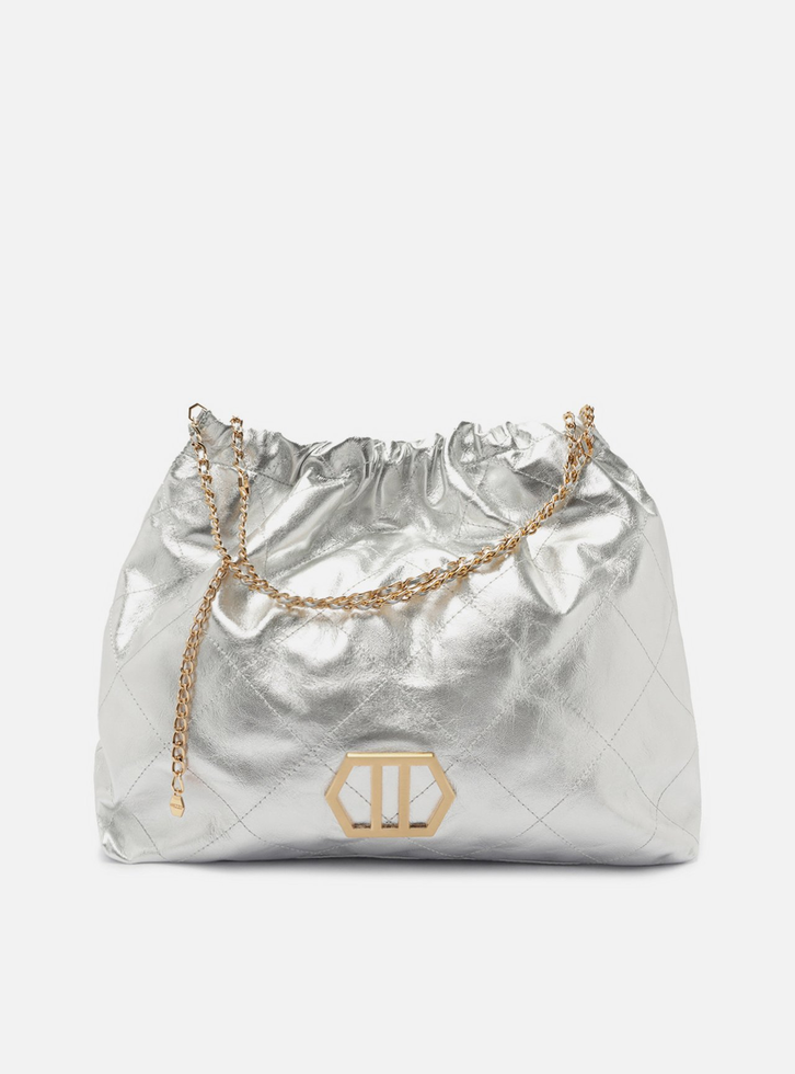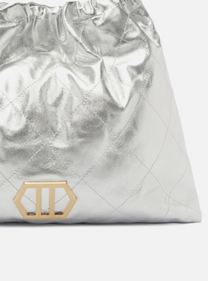 Bolsa hobo grande de couro prata. O modelo tem formato soft, acabamento com costuras em matelassê e aplicação de metal com ID da marca, geométrico e vazado na capa. Traz alça de ombro ou tiracolo em correntes metálicas com enfiados em couro e pingente hexagonal do nome da marca. Com fecho superior em enforcador e imã interno.