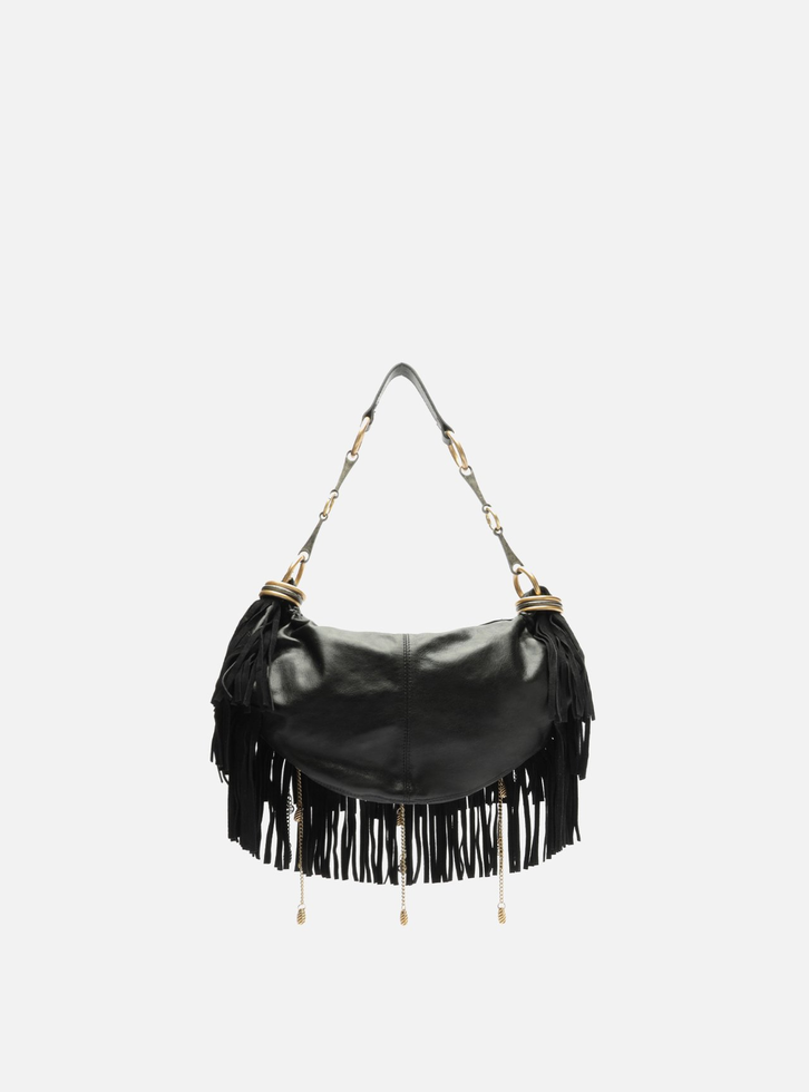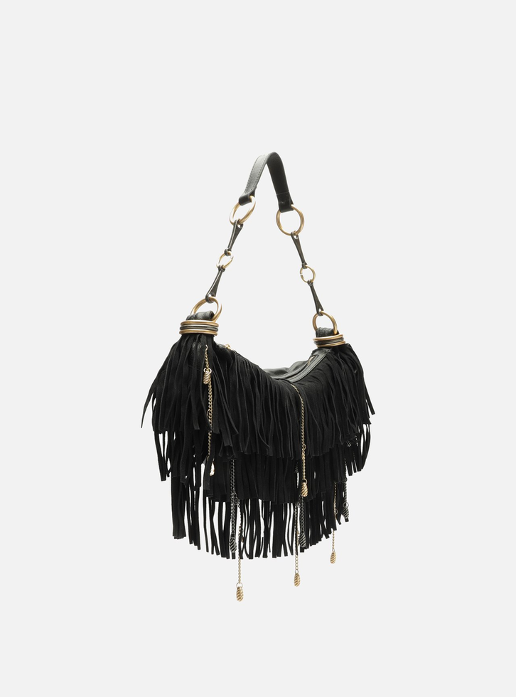 Bolsa hobo pequena em couro e camurcina preta. O acessório tem formato arredondado e franjas sobre as capas. Traz alça de ombro, fecho superior em zíper e puxador.