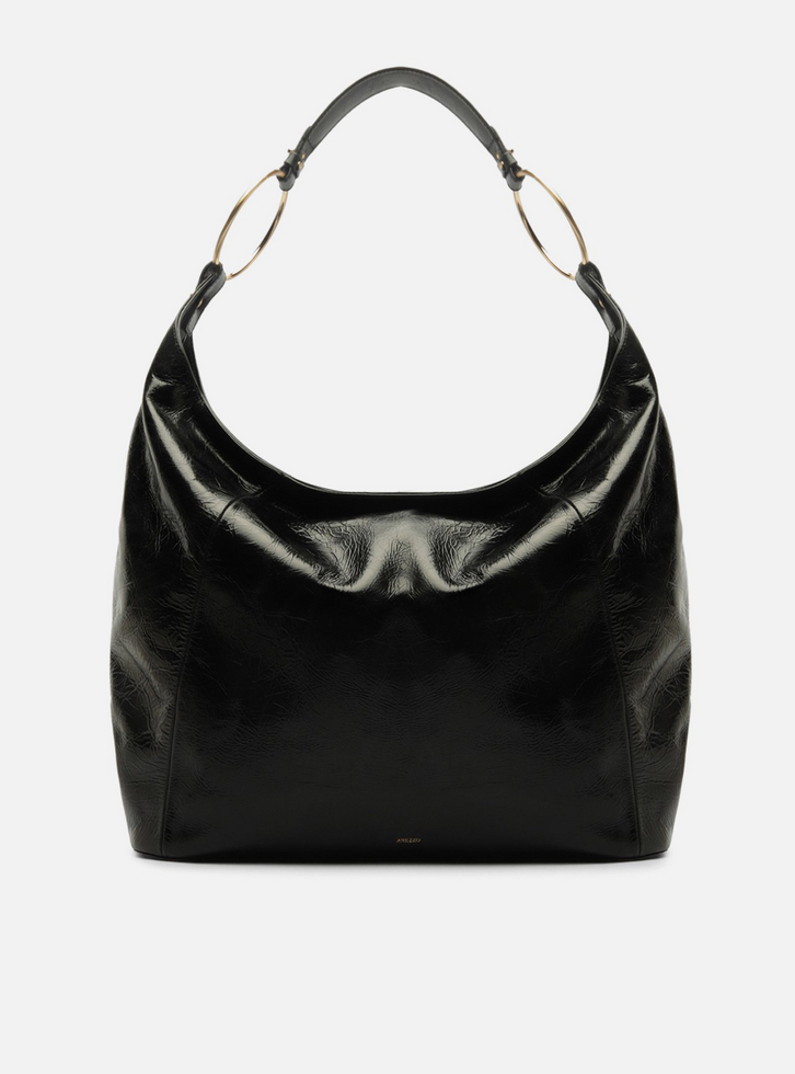 Bolsa hobo grande em couro preto. O acessório tem formato estruturado, laterais arredondadas, acabamento macio e brilho suave. Traz alça curta de ombro com argolas metálicas ovaladas nas laterais. Possui fecho superior em zíper com puxador e parte interna forrada.