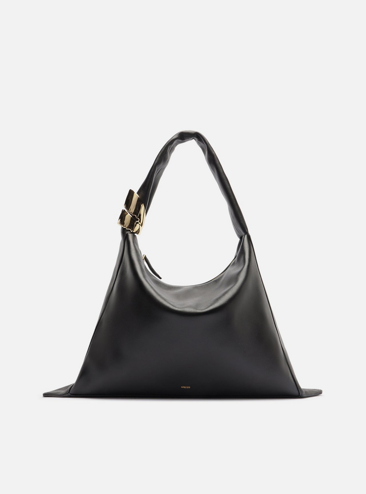 Bolsa hobo grande preta de couro. O acessório tem formato e acabamento macio. Traz alça larga e contínua ao corpo da bolsa. Possui detalhe lateral em metal dourado orgânico e vazado, aplicado em uma das extremidades da alça. Fechamento superior em zíper e puxador. Com inscrição do nome da marca na capa.