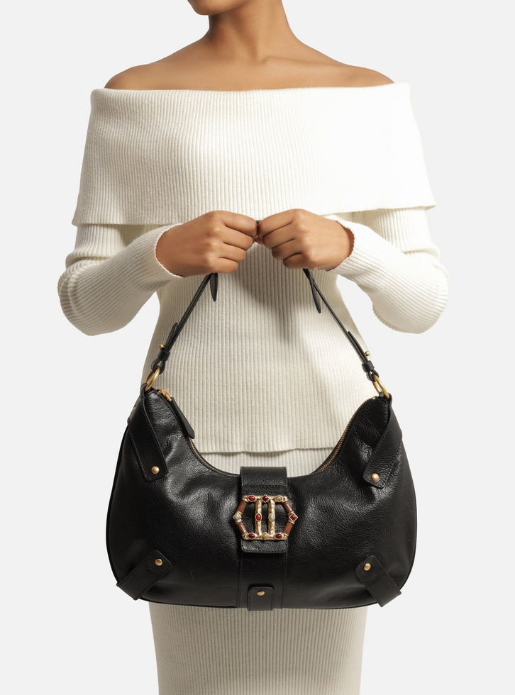 Bolsa hobo grande em couro preto com efeito desgastado. O acessório tem formato estruturado e laterais arredondadas. Traz aplicação metálica sextavada na capa, com detalhes em resina e pedras coloridas, sobre tira larga e imã. Possui alça de ombro com ombreira e argolas laterais metálicas, além de tiras e rebites nas capas. Fecho superior em zíper com puxador e parte interna forrada.