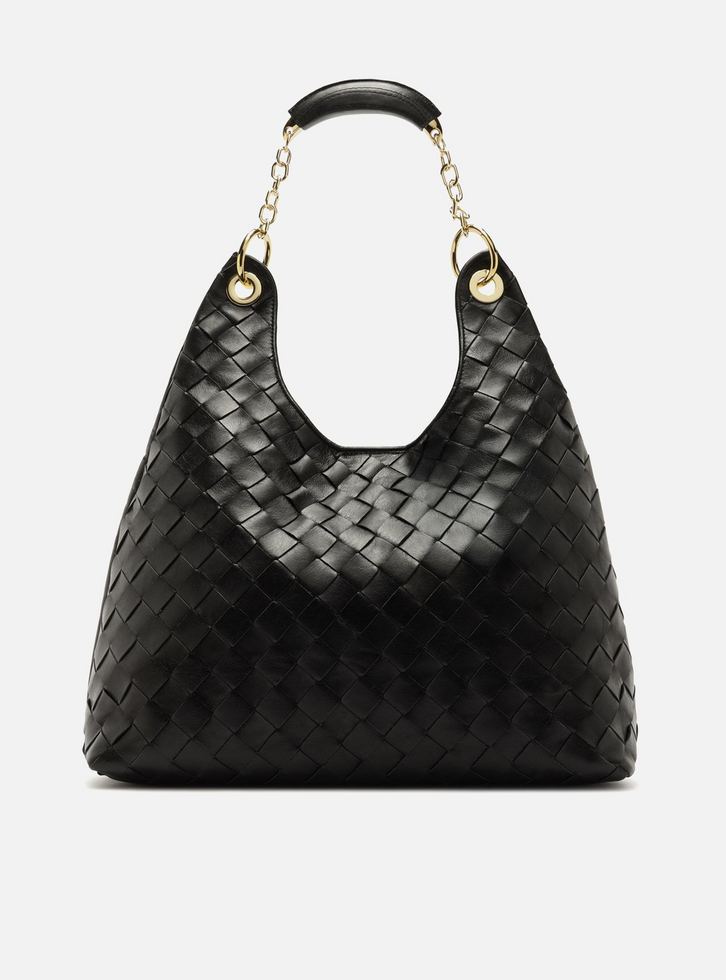 Bolsa feminina hobo grande em couro preto com acabamento em tressê. O acessório tem formato estruturado e recorte em U na parte superior. Possui alça em correntes metálicas presas por ilhoses e argolas, com peça larga em couro na parte central. Fecho superior em ímã interno.
