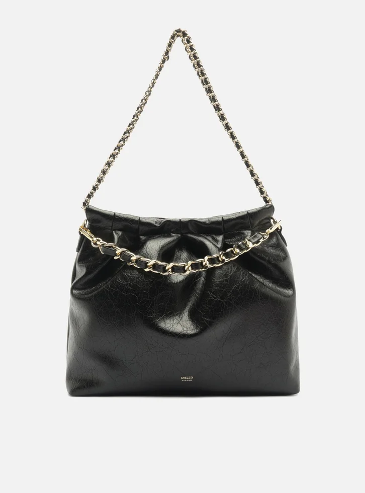 Bolsa hobo grande preta com acabamento macio e envernizado. O acessório tem formato maleável. Possui alça de ombro e fecho superior em enforcador. Traz detalhe em corrente metálica aplicada na capa frontal.